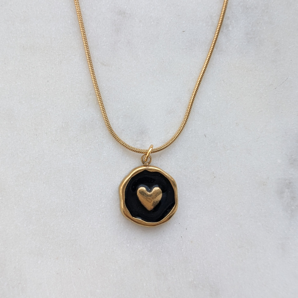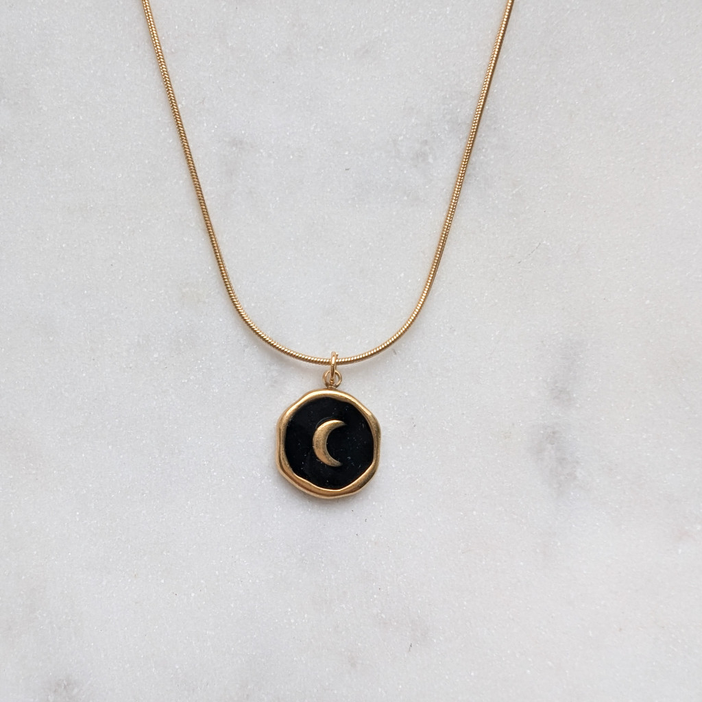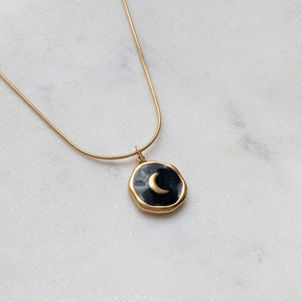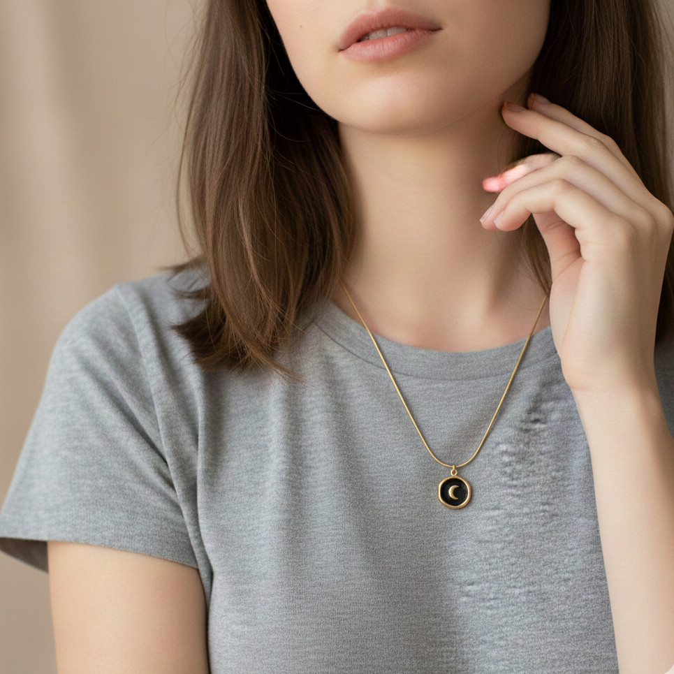Kerek, fekete alapon aranyszínű, hold vagy szív mintájú medál vékony kígyóláncon.