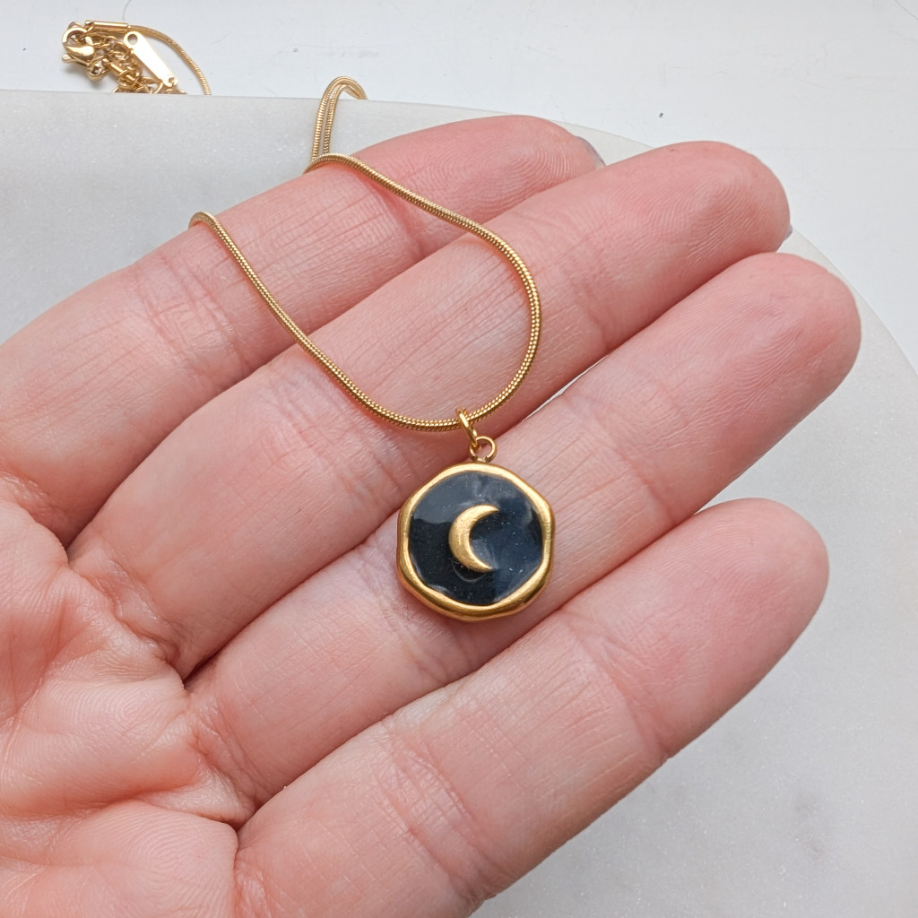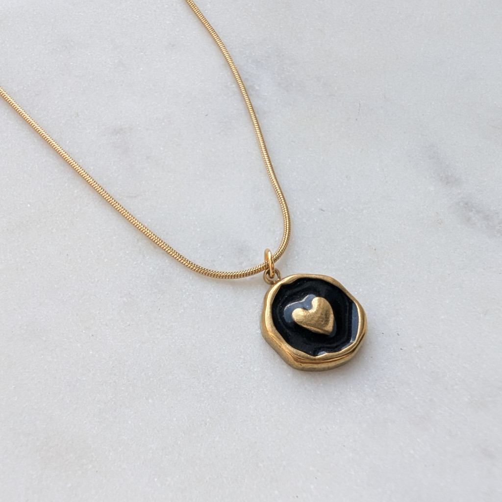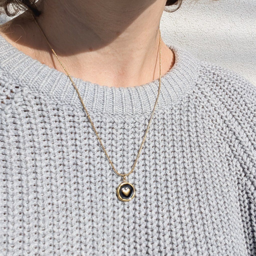 Kerek, fekete alapon aranyszínű, hold vagy szív mintájú medál vékony kígyóláncon.