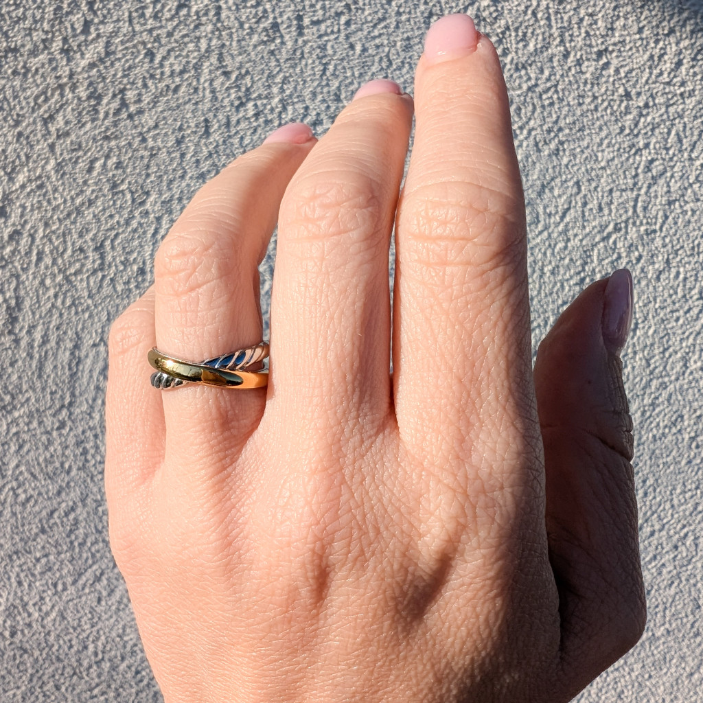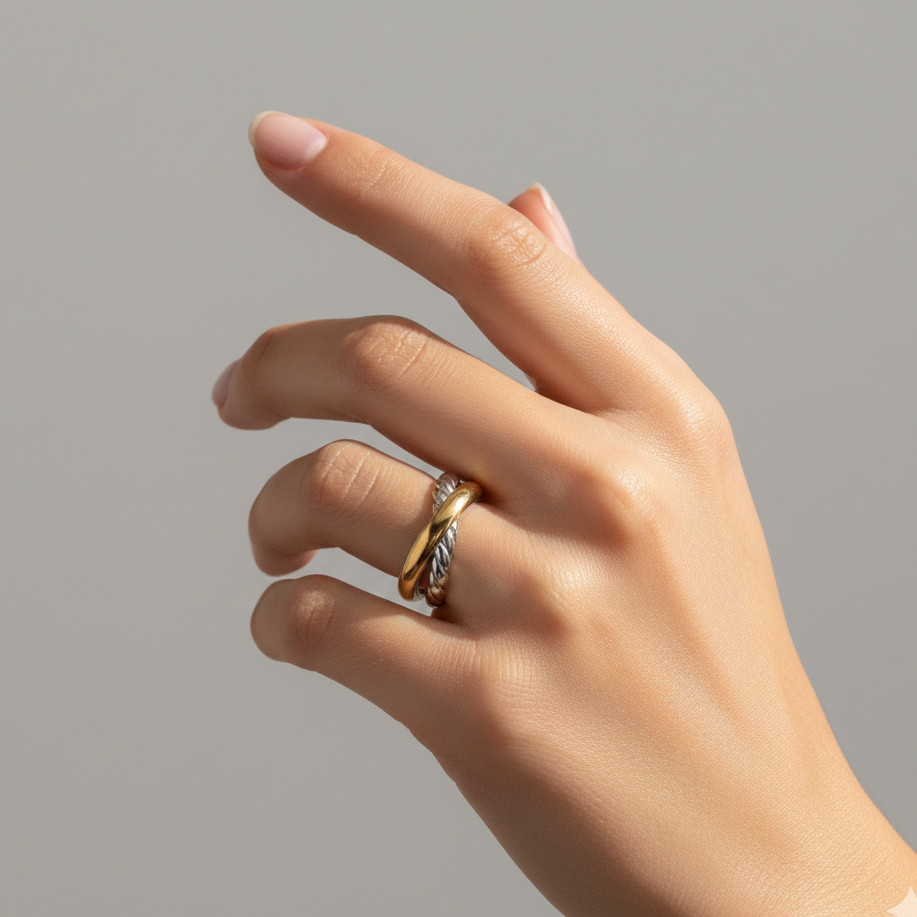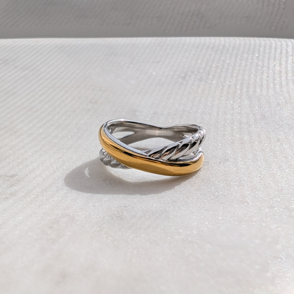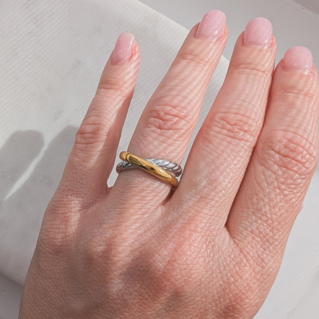 Elegáns, mégis modern gyűrű vízálló nemesacélból. Két, átlós gyűrűt formázó, ezüst alapszínű gyűrű, vékony arany sáv díszítéssel.