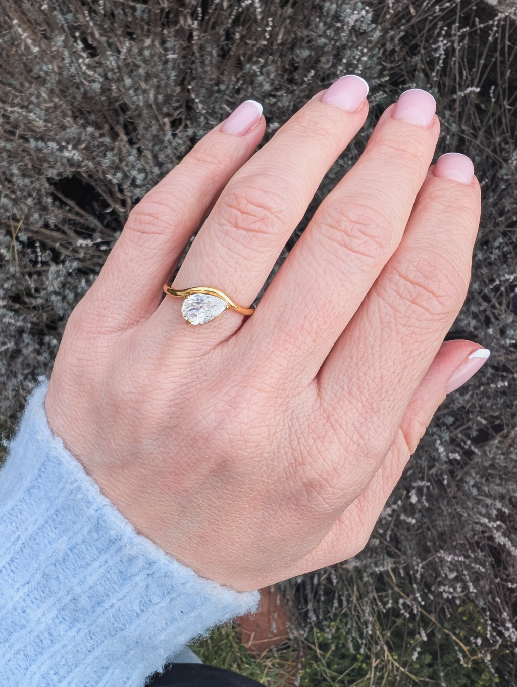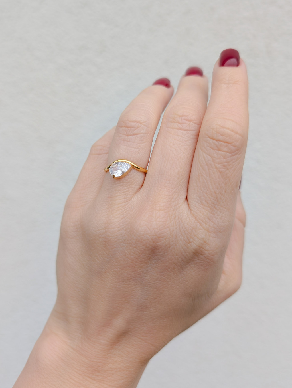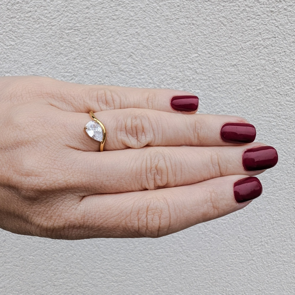 Vékony, minimalista stílusú gyűrű csillogó, csepp formájú kővel. Egy igazán elegáns kiegészítő, különleges alkalmakra, kifinomult szettekhez!