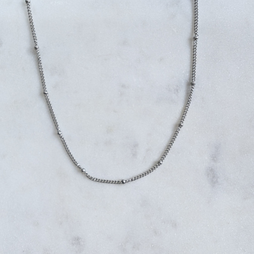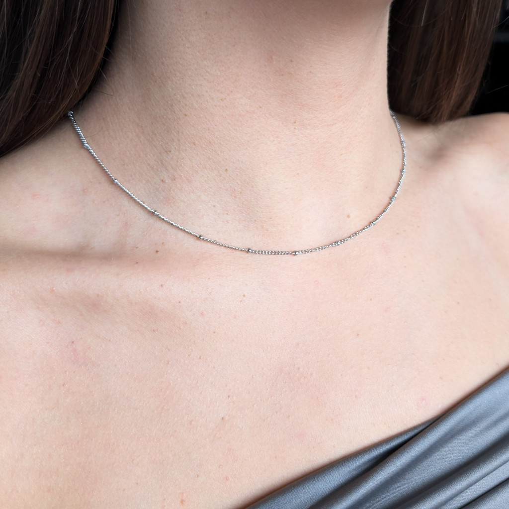 Pici gömbökkel díszített vékony choker lánc nemesacélból. Magában, vagy más láncokkal kombinálva is viselhető.
