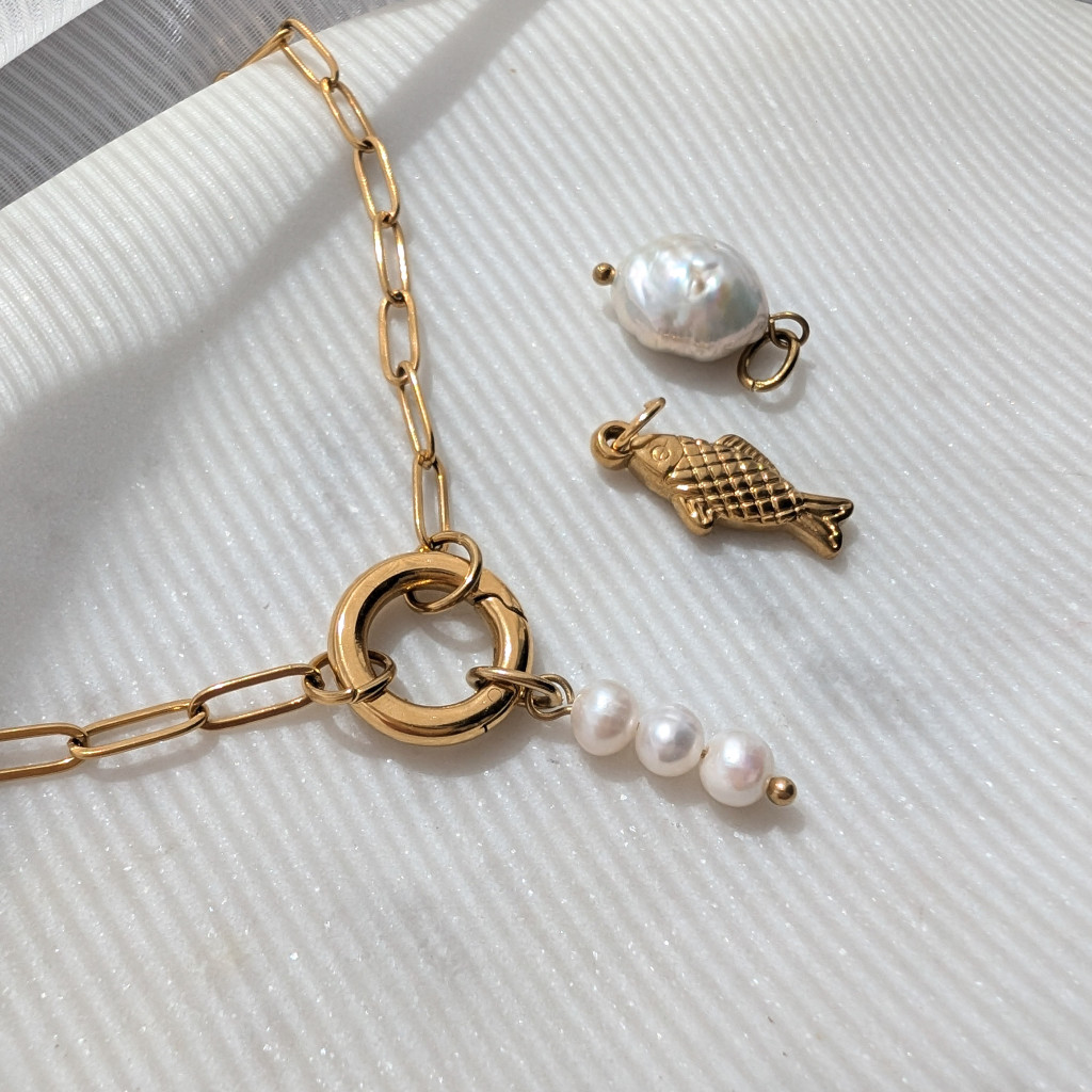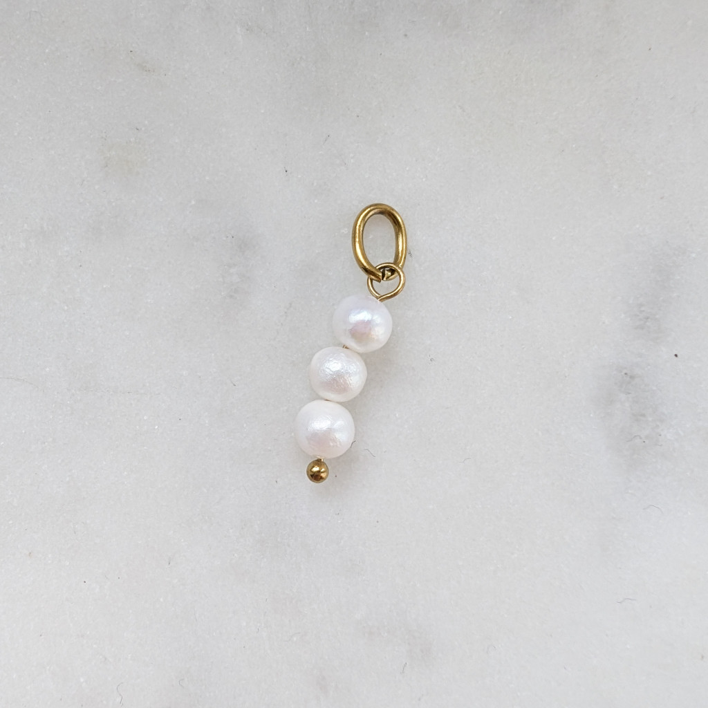Három pici édesvízi gyöngy, egy függőre felfűzve. Teheted karikafülbevalóra, karabíneres nyakláncra vagy Eliza nyakláncunkra.