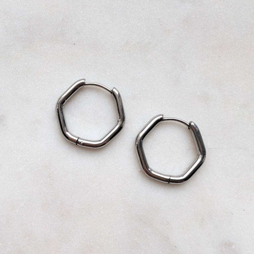 Hatszög formájú fülbevaló, kényelmes csatos zárral, antiallergén nemesacélból.