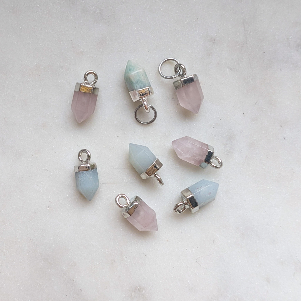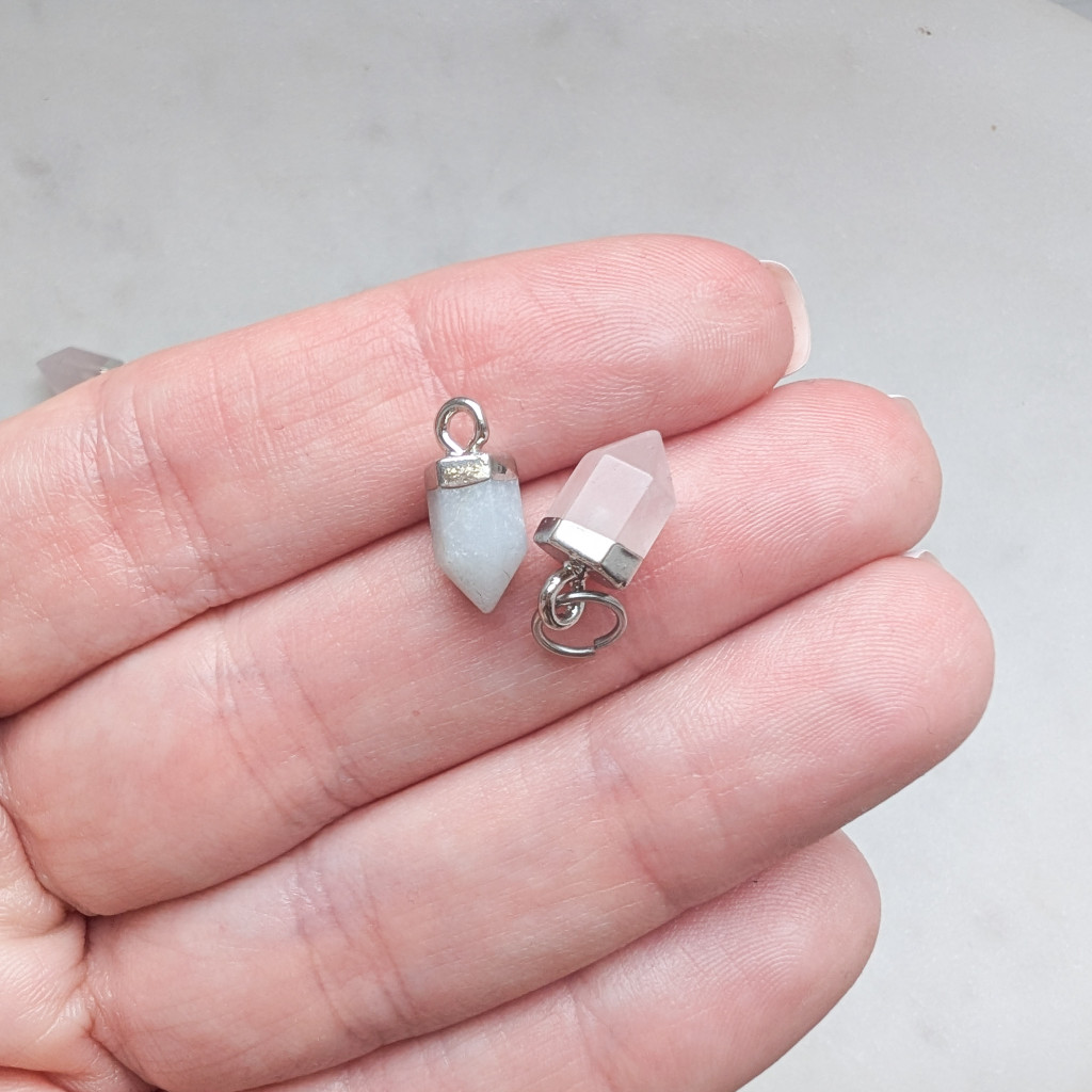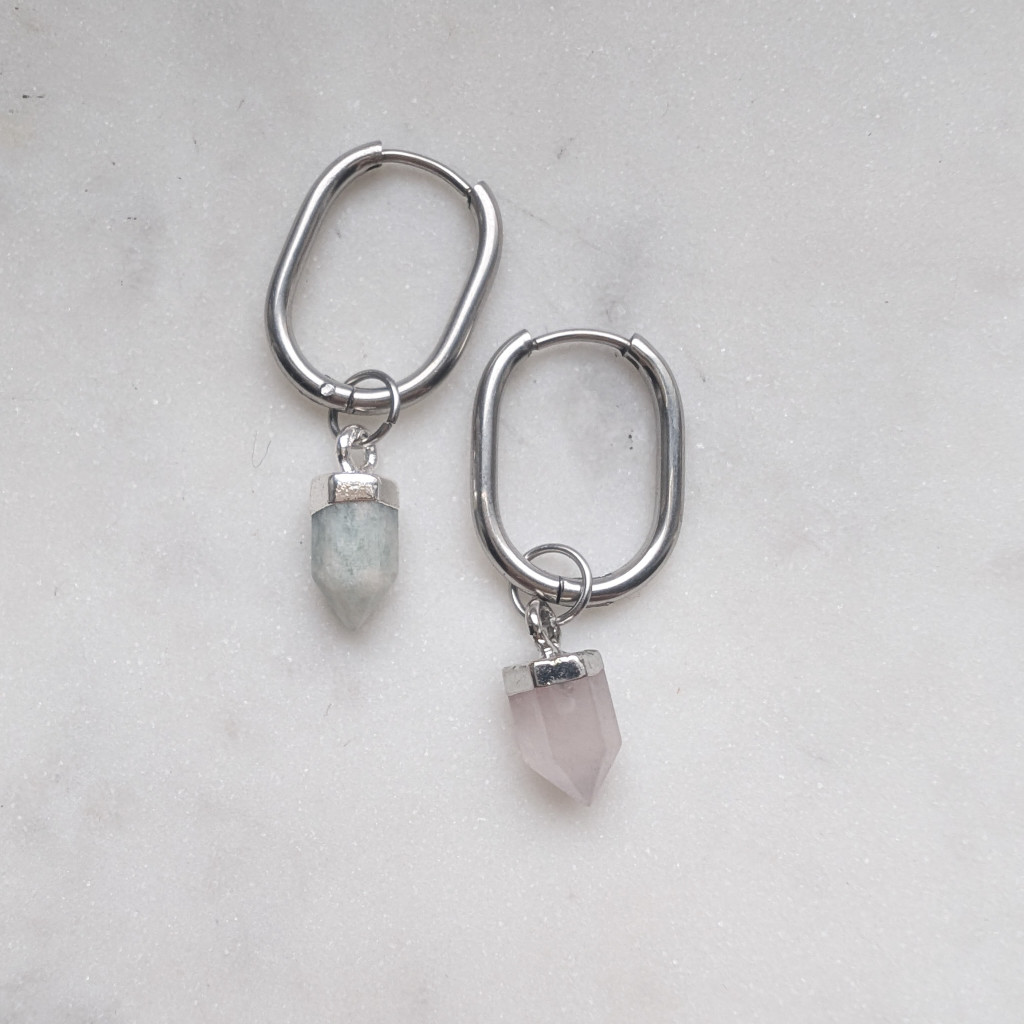 Hosszúkás formájú ásvány függő, ezüst színű foglalattal, és karikával. Fülbevalóra és nyakláncra, karkötőre is felfűzheted.