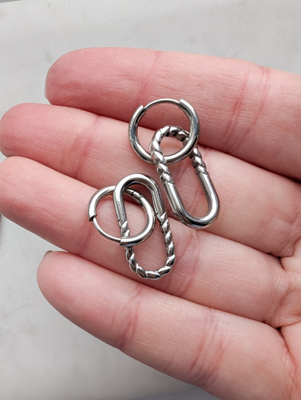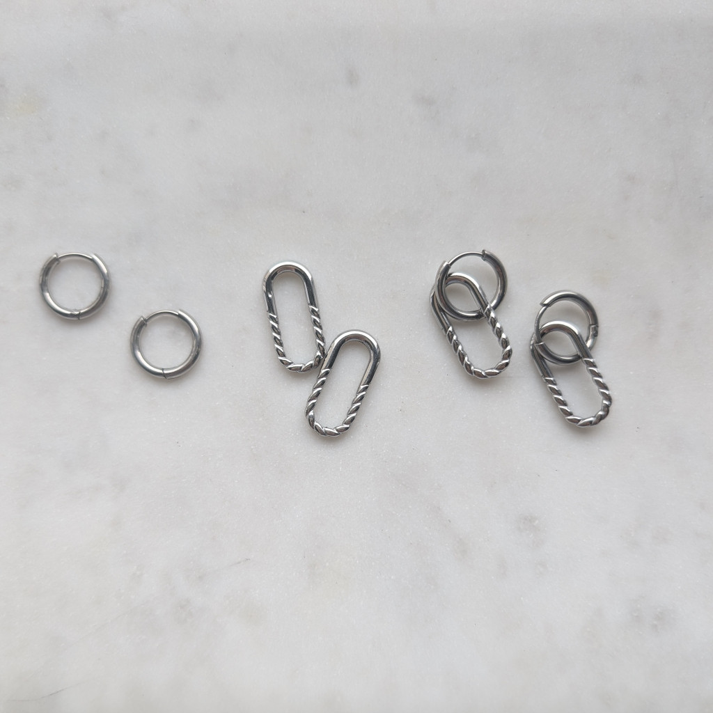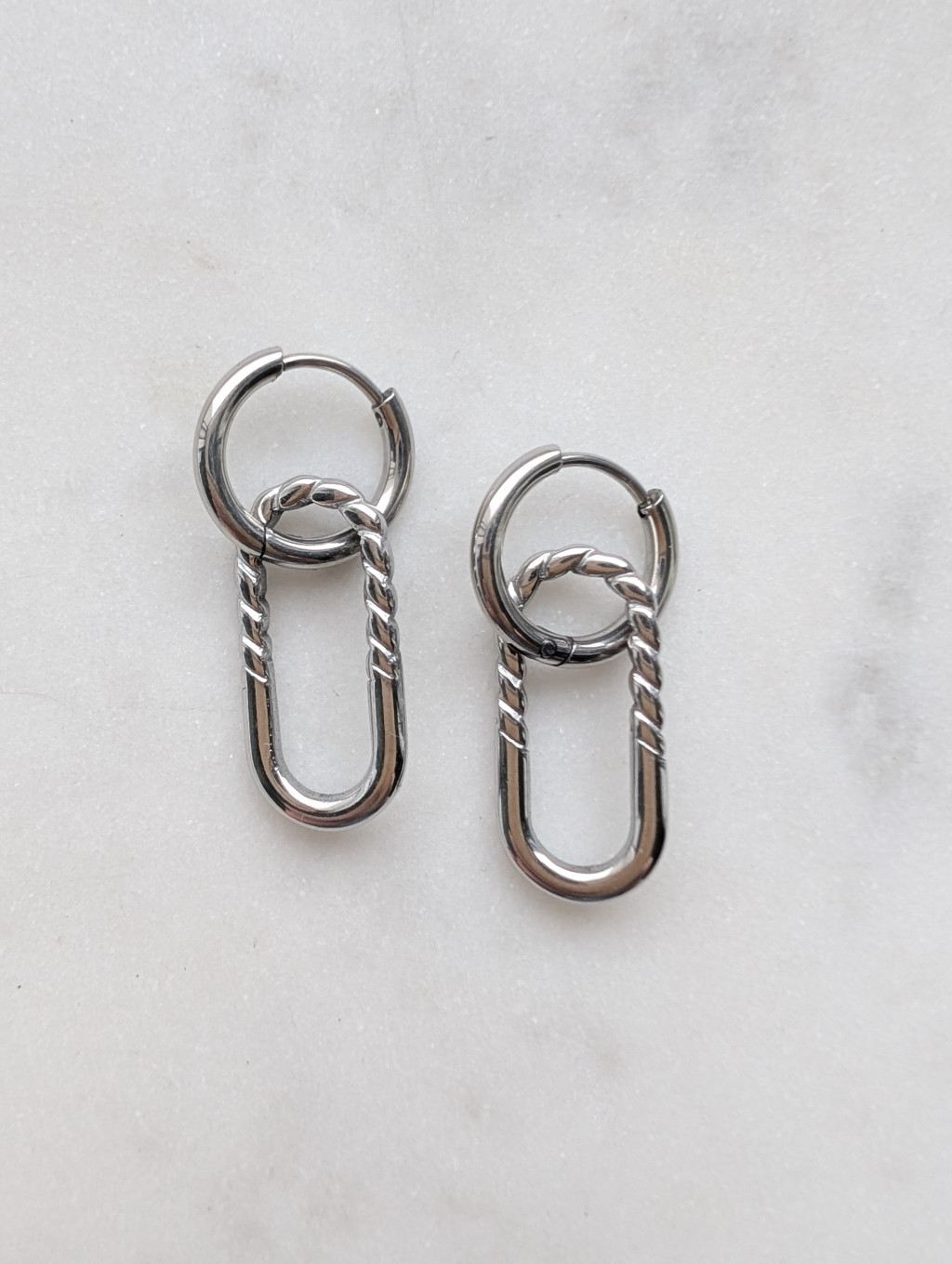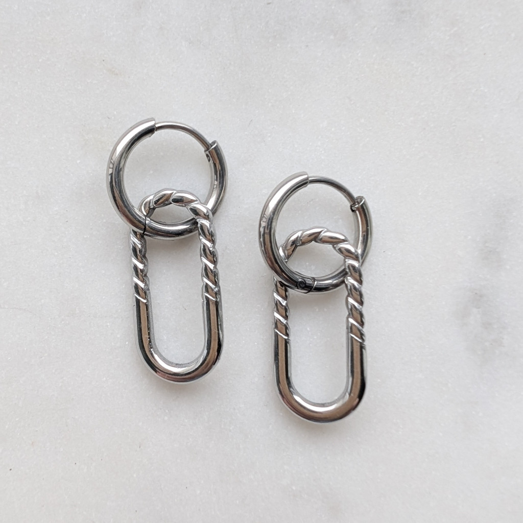 Egyedi acél fülbevaló, csatos karika és ovális fém függő résszel. Különleges, letisztult és modern kiegészítő, melyet akár minden nap viselhetsz.