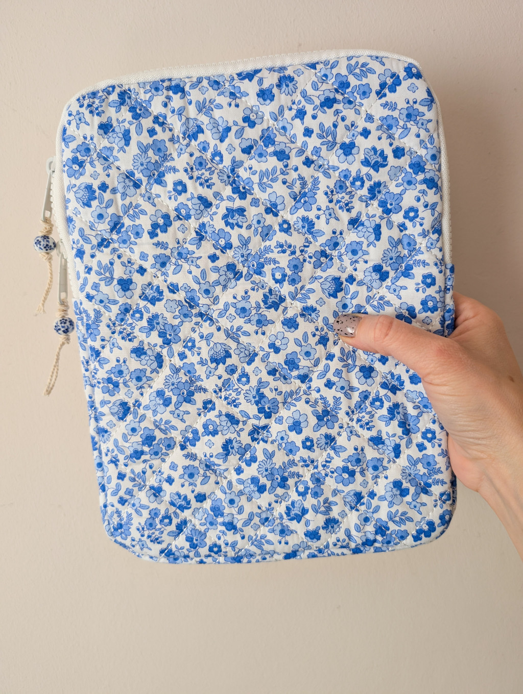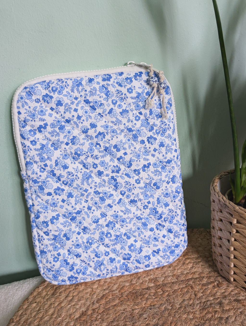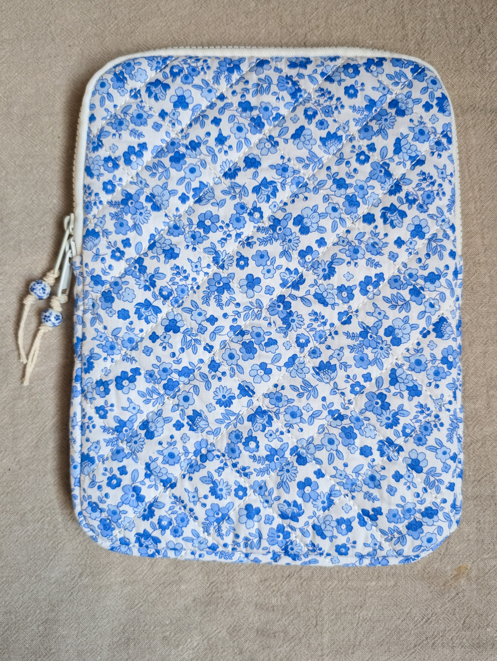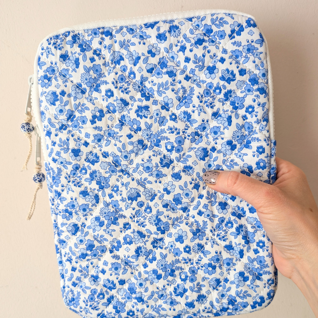 Fehér alapon sötétkék virágokkal díszített, steppelt, vászon tok, szivaccsal és puha plüss béléssel. Védi a tableted a karcolásoktól, ütésektől.