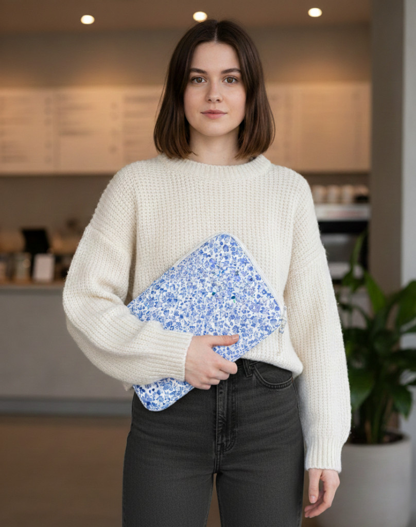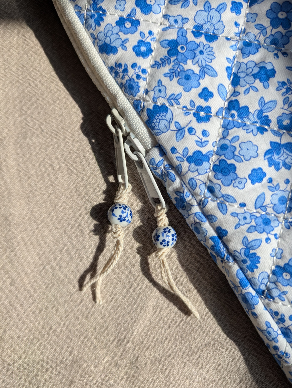 Cipzárját azonos mintájú, virágos, porcelán gyöngyök díszítik, melyek kézzel készült díszként kerülnek a tokra.