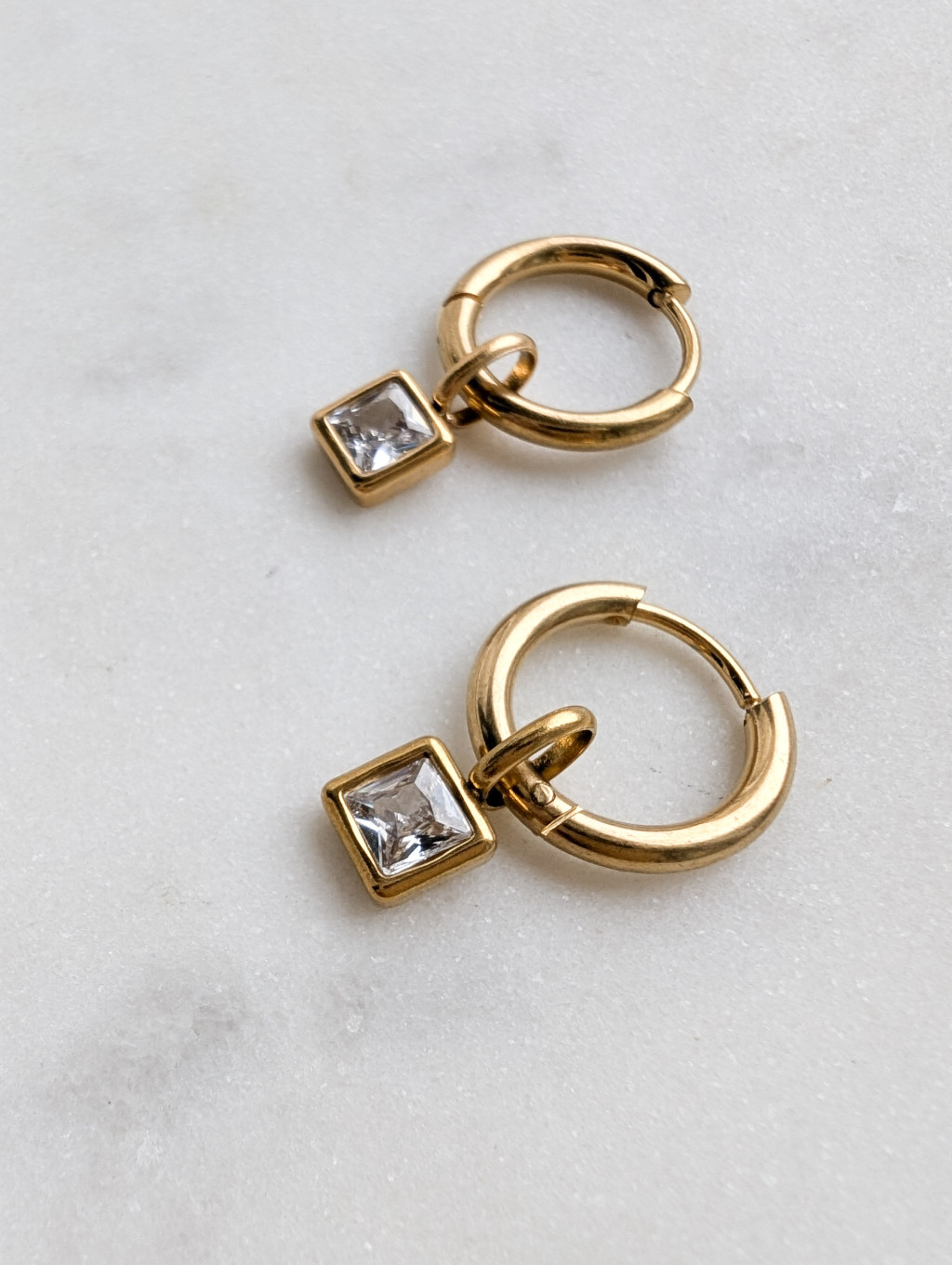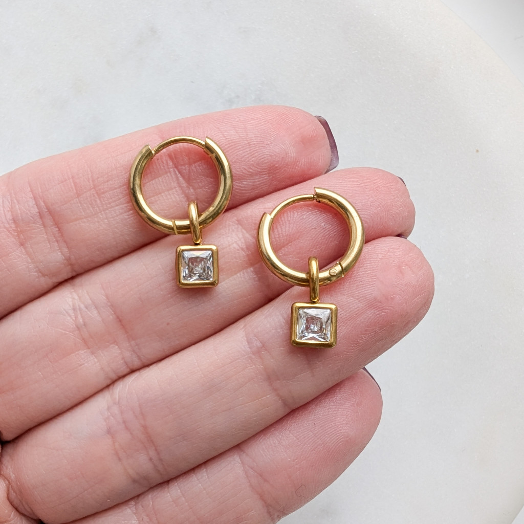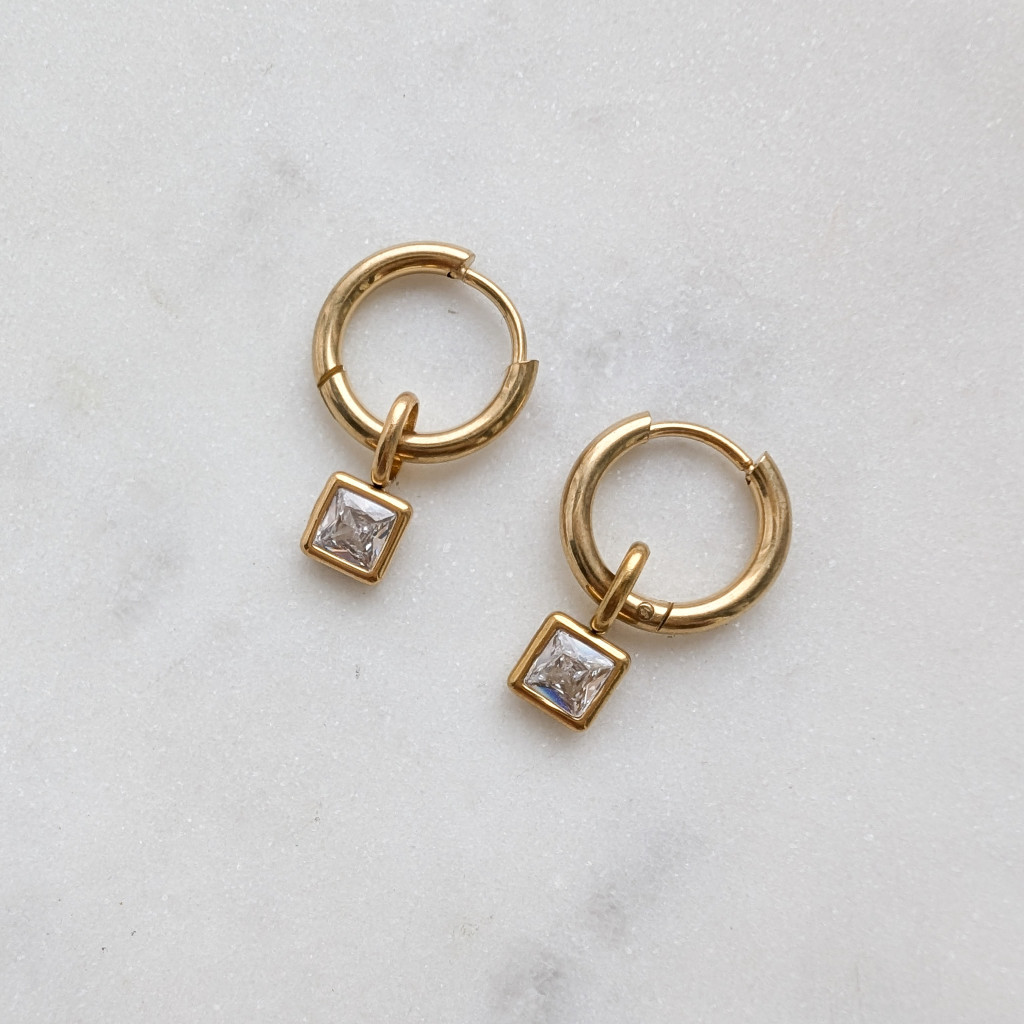 Kis, négyzet alakú átlátszó kővel díszített karikafülbevaló, nemesacélból.