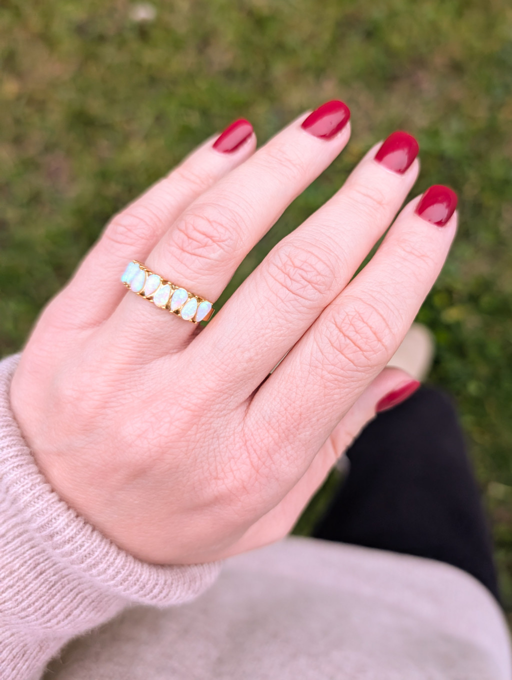 Csepp alakú opálkövekkel kirakott nemesacél gyűrű. Különleges, egyedi ékszer, a modern és trendi darabok kedvelőinek.