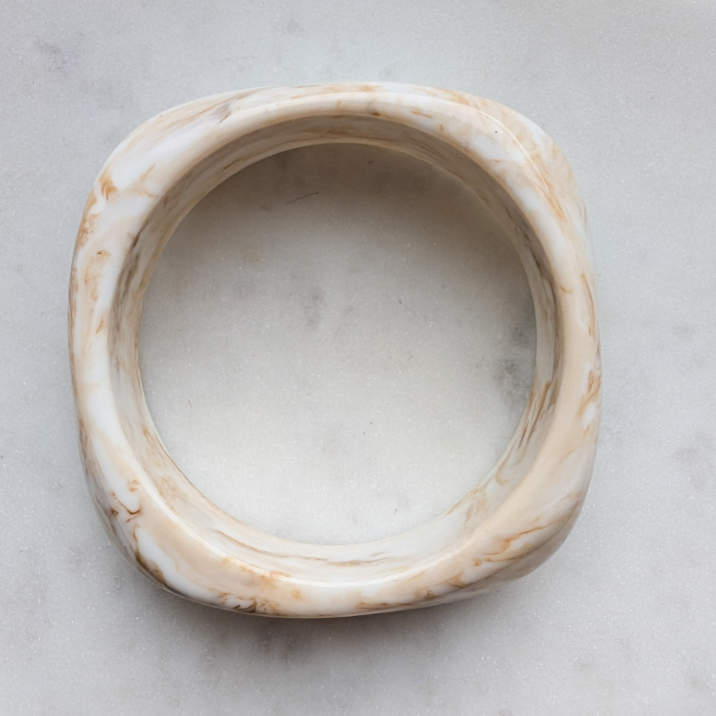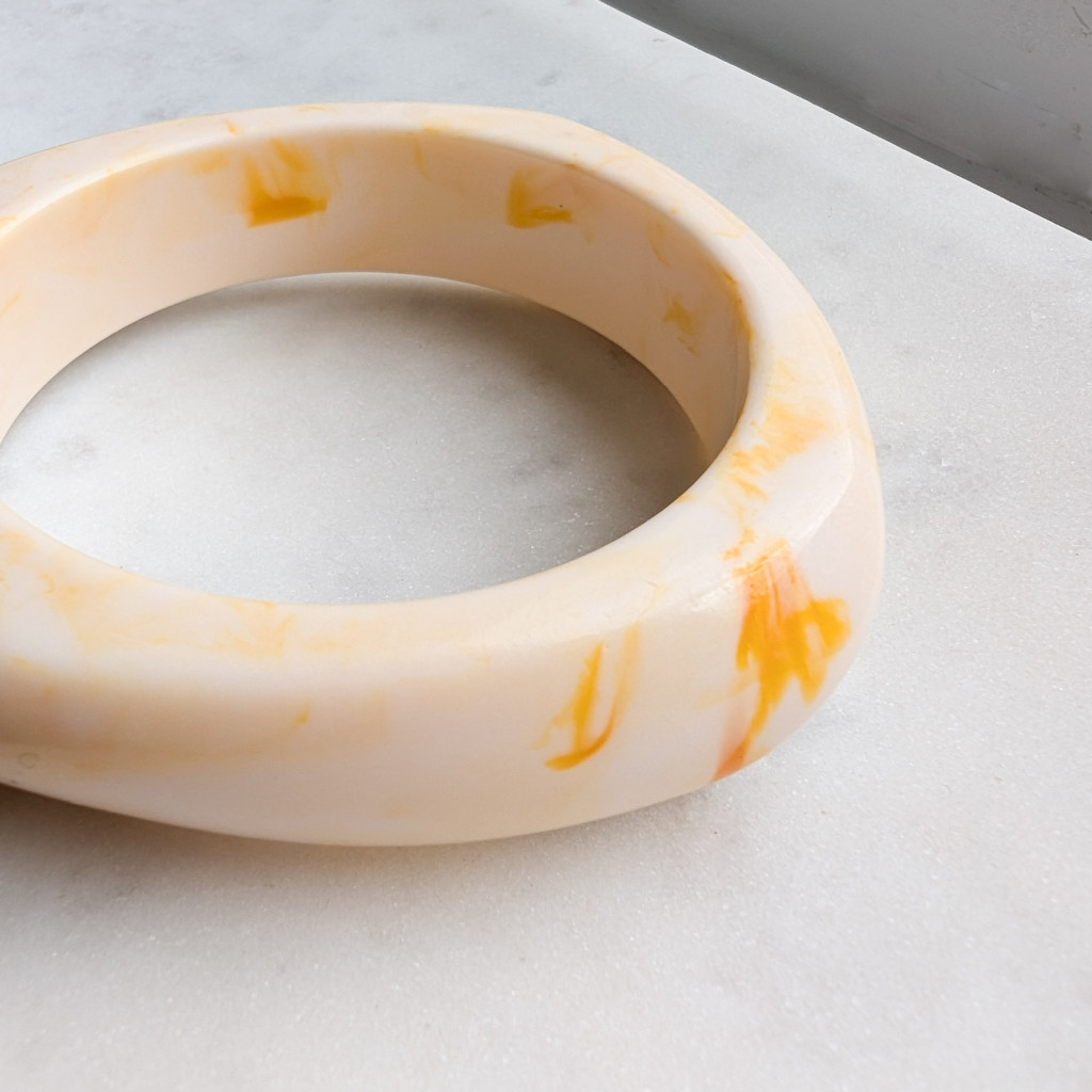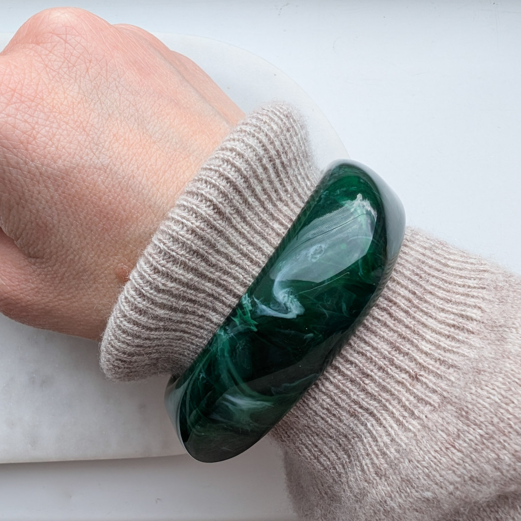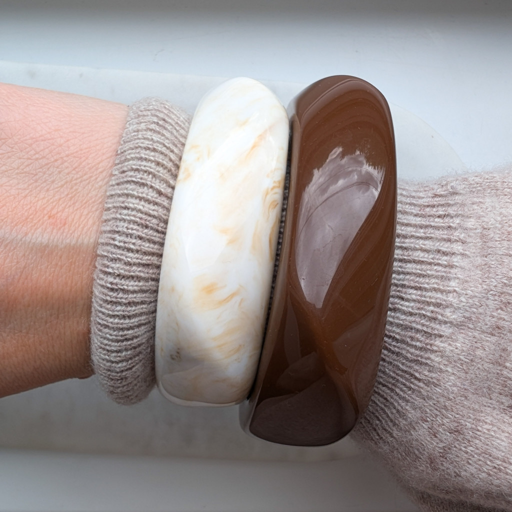 Széles, zárt karperec, kemény akrilból, sima felülettel, izgalmas formával.