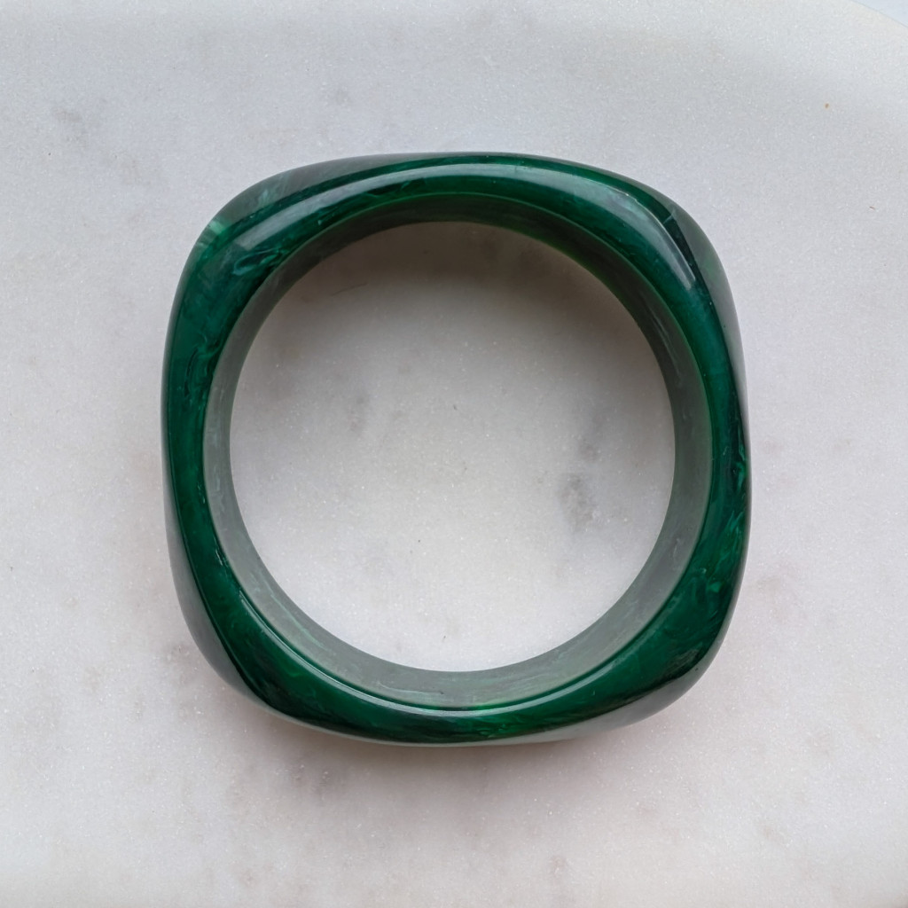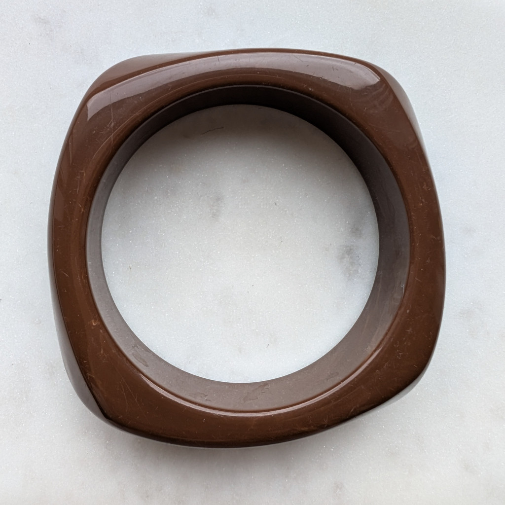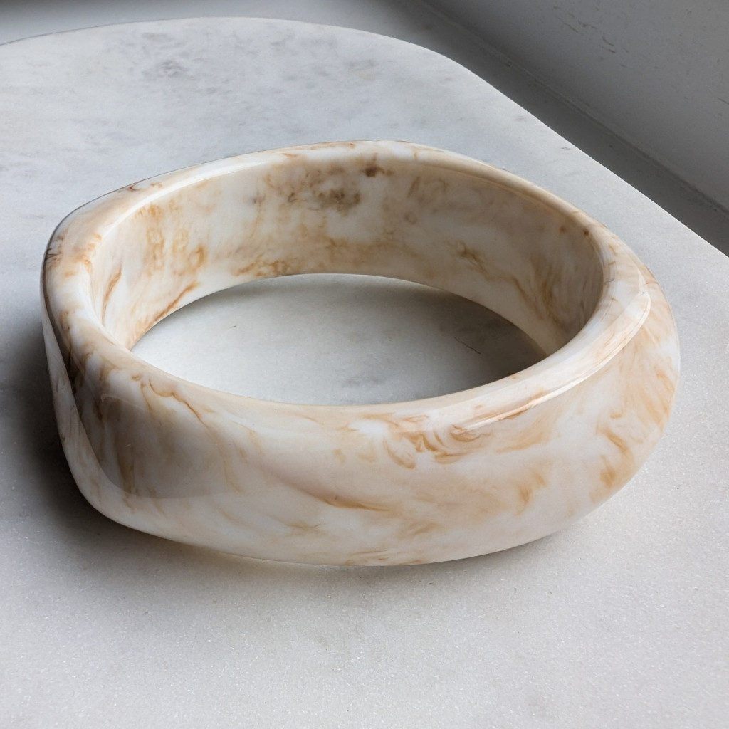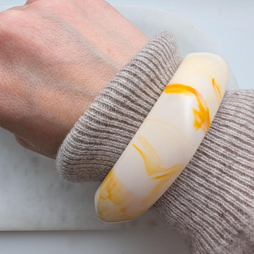 Széles, zárt karperec, kemény akrilból, sima felülettel, izgalmas formával.
