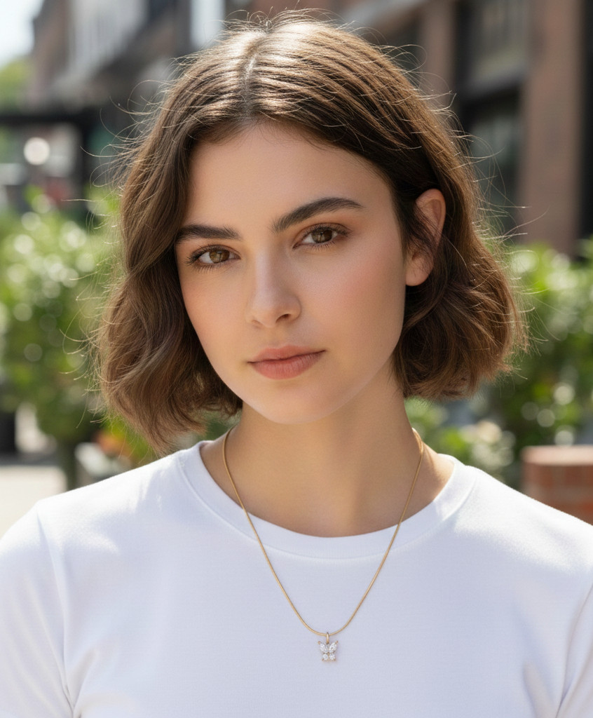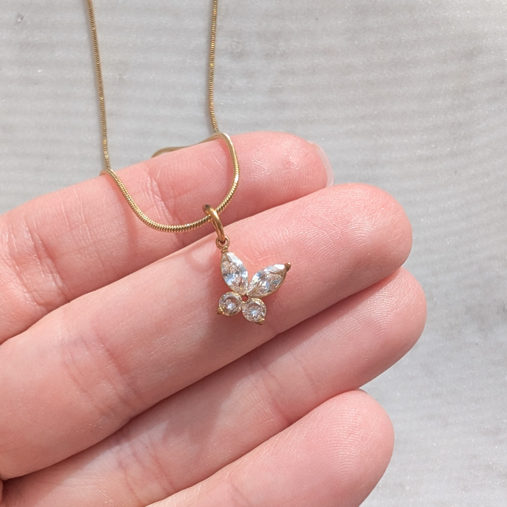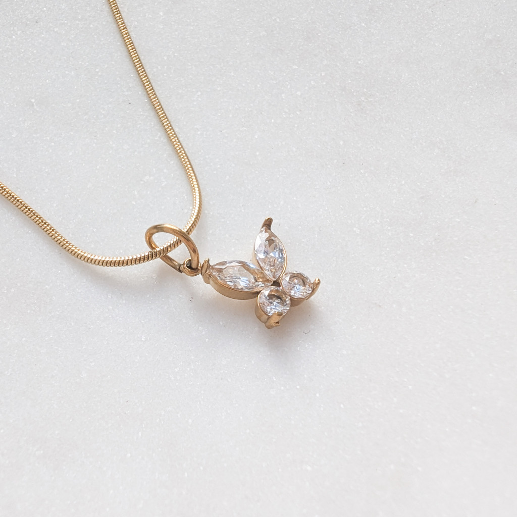 Pillangó formájú medál, négy csillogó, átlátszó cirkóniakővel, nemesacél foglalattal.