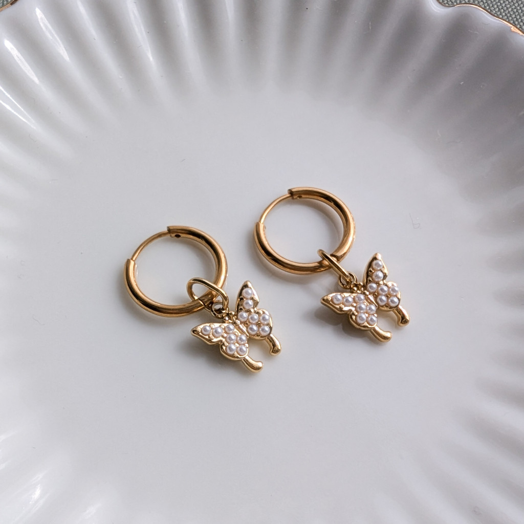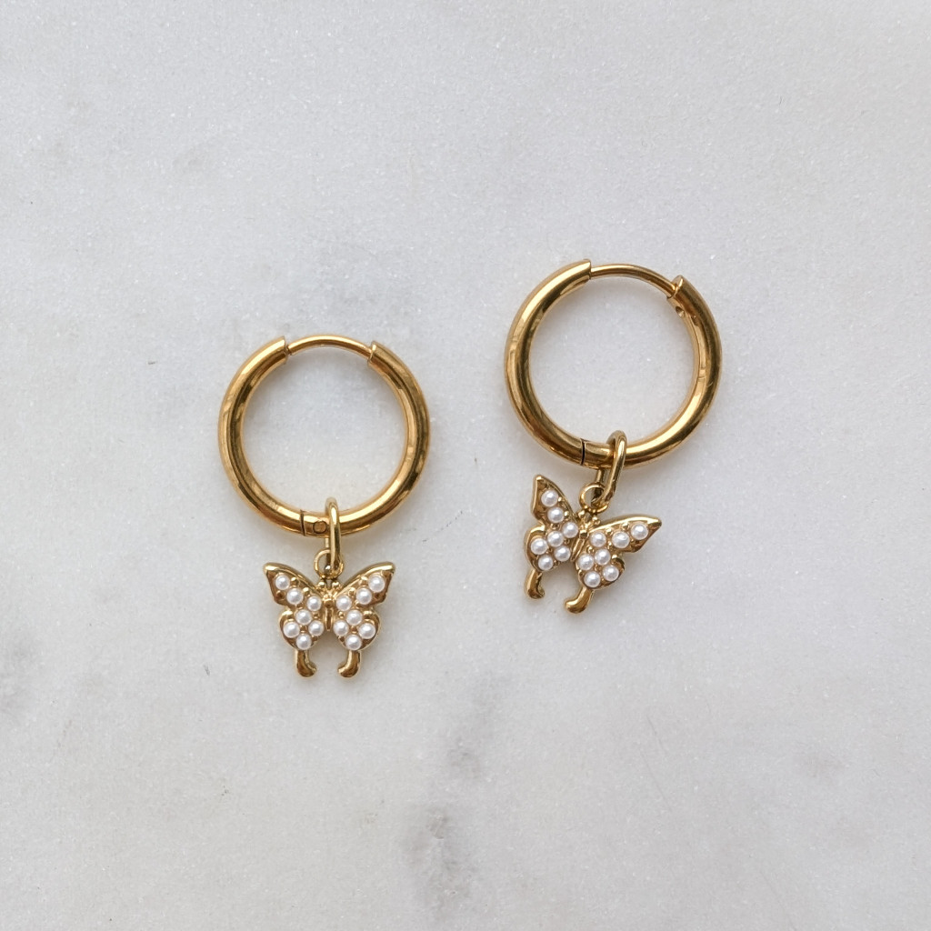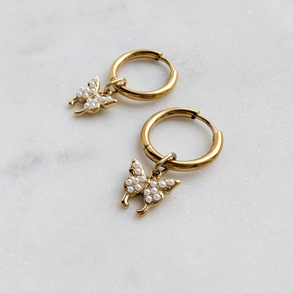 Pillangófüggős fülbevaló, apró gyöngyökkel díszített pillangók, vékony nemesacél karikán.