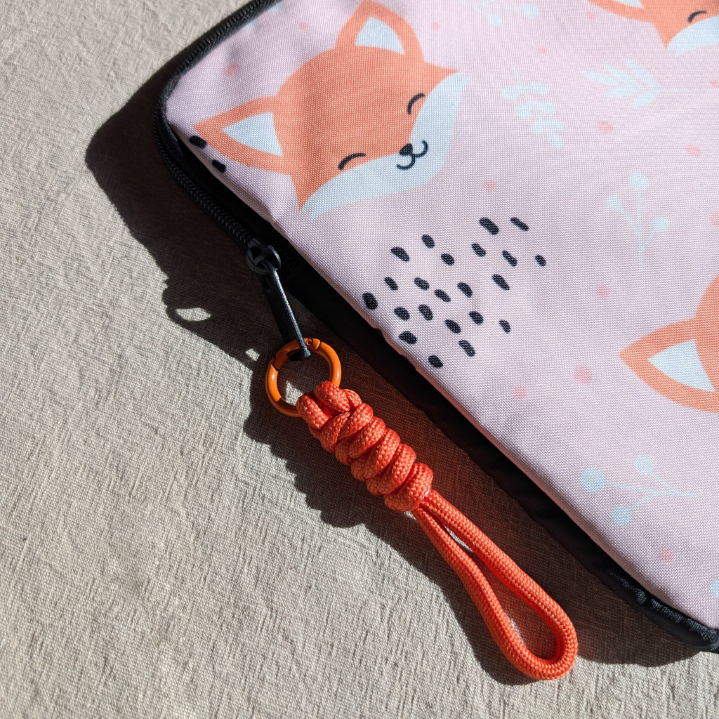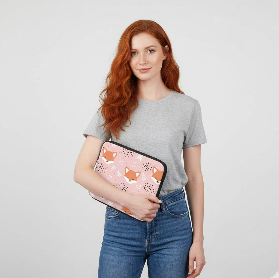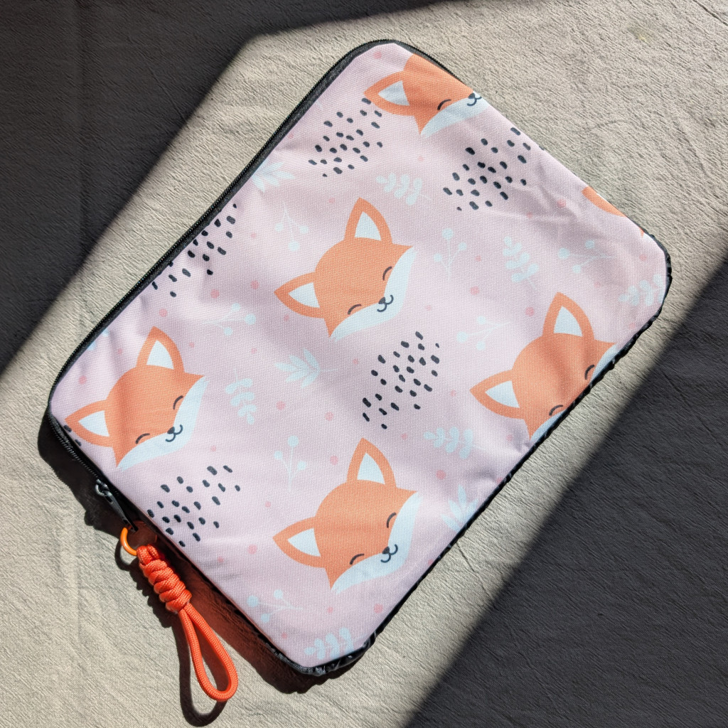 Róka mintás, rózsaszín hátterű laptop tok, többféle színű választható cipzárdísszel. Vidám és egyedi kiegészítő munkaeszközöd számára!