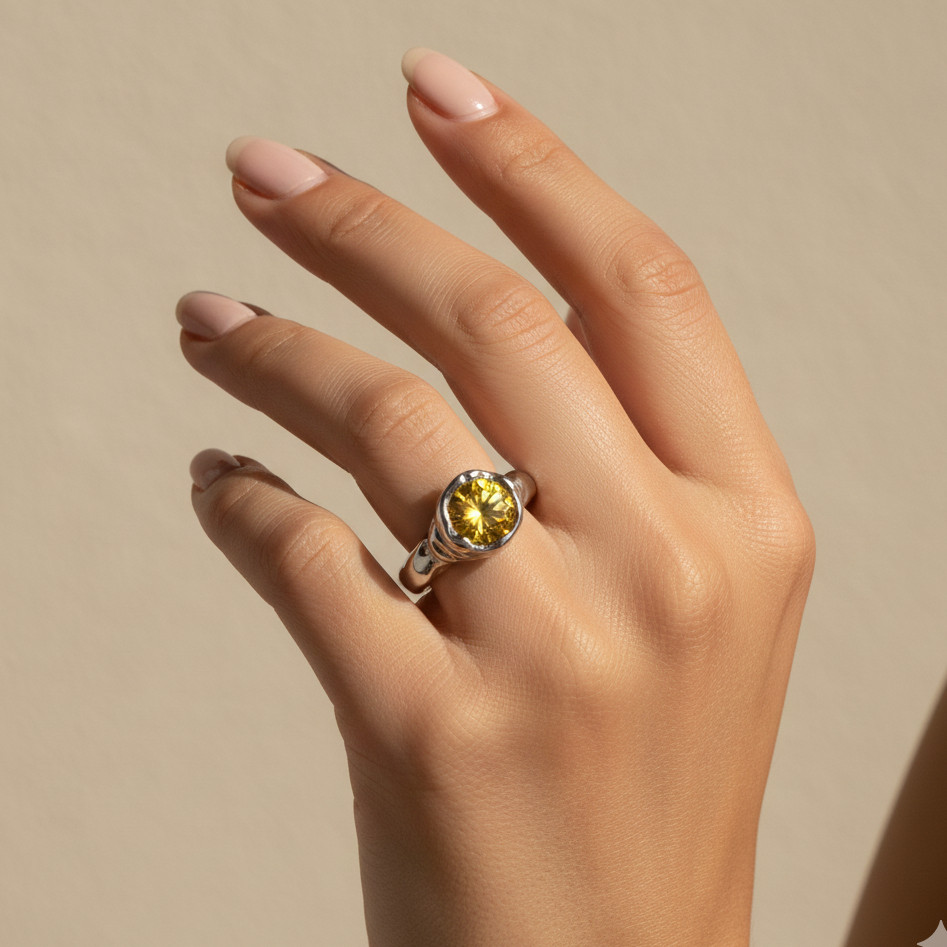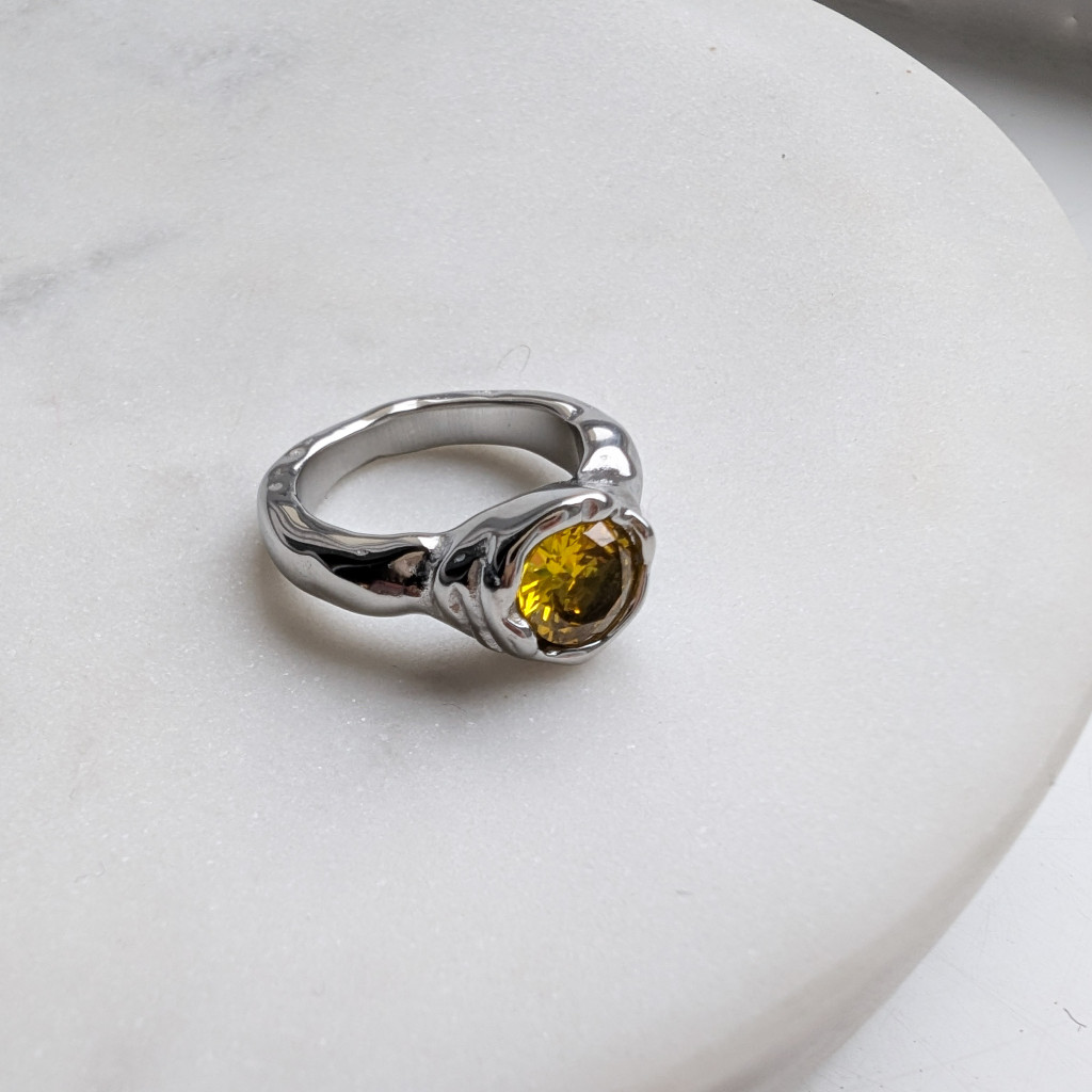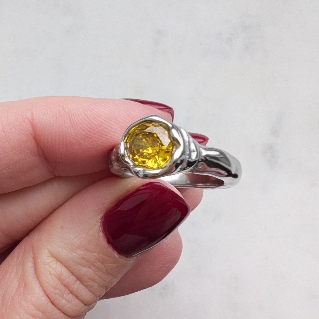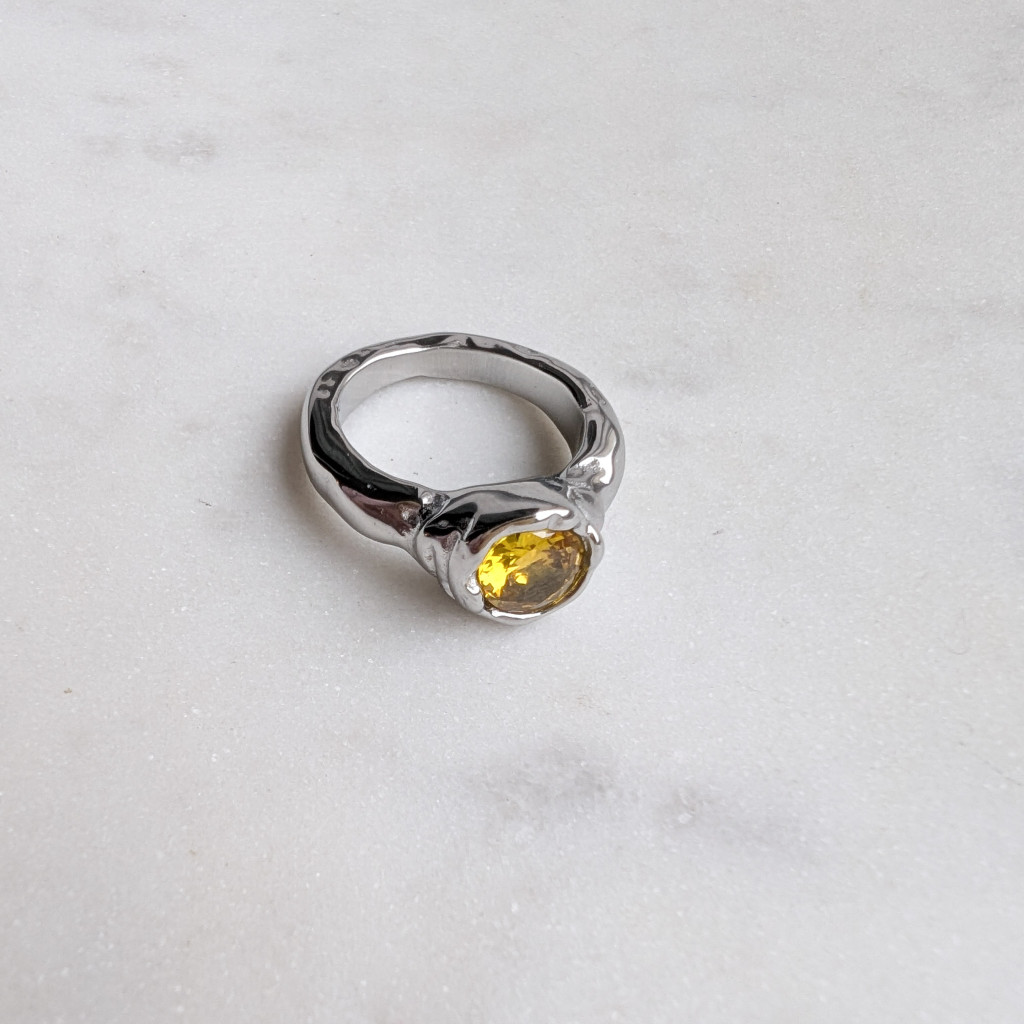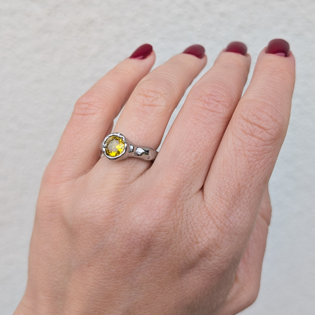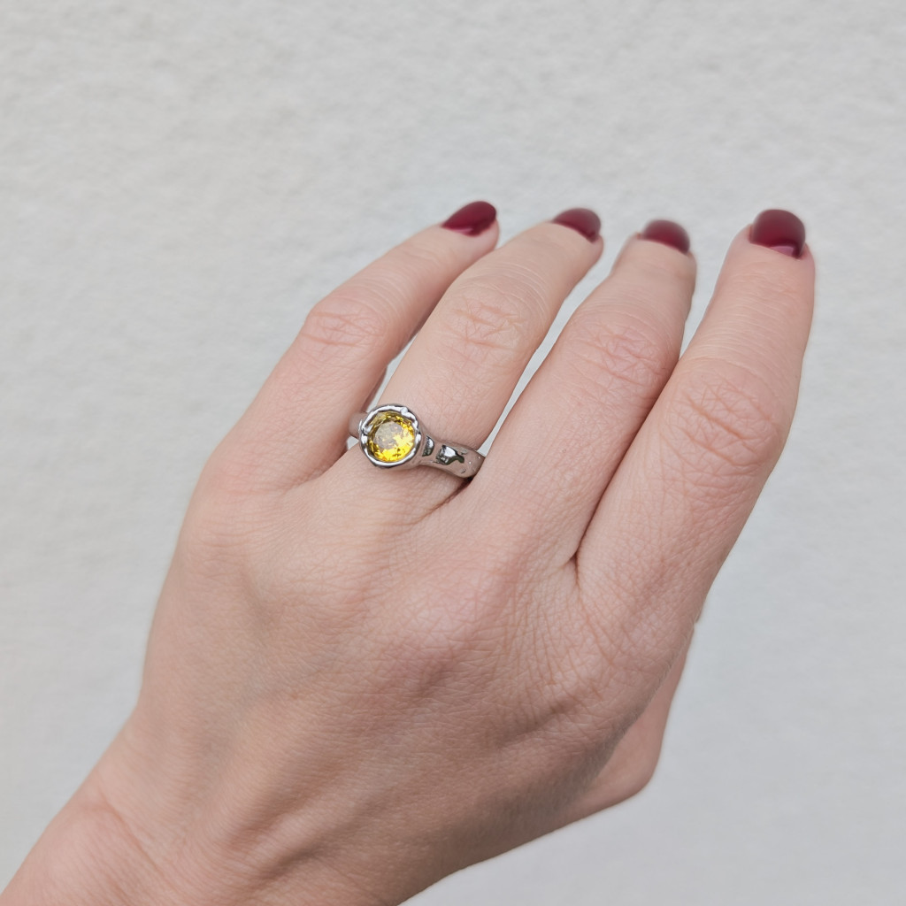 Kézzel készült hatást keltő, rusztikus felületű gyűrű, kerek sárga kővel díszítve.
