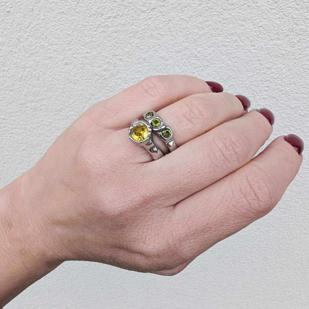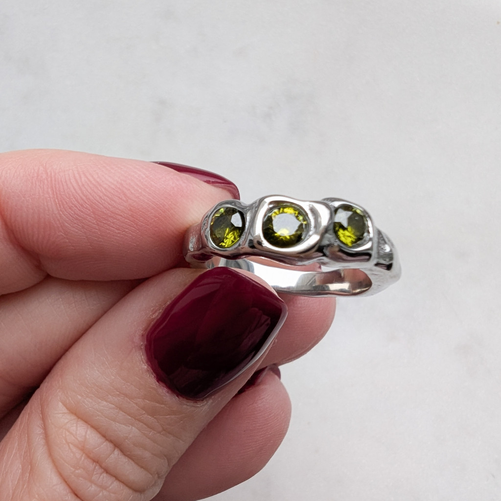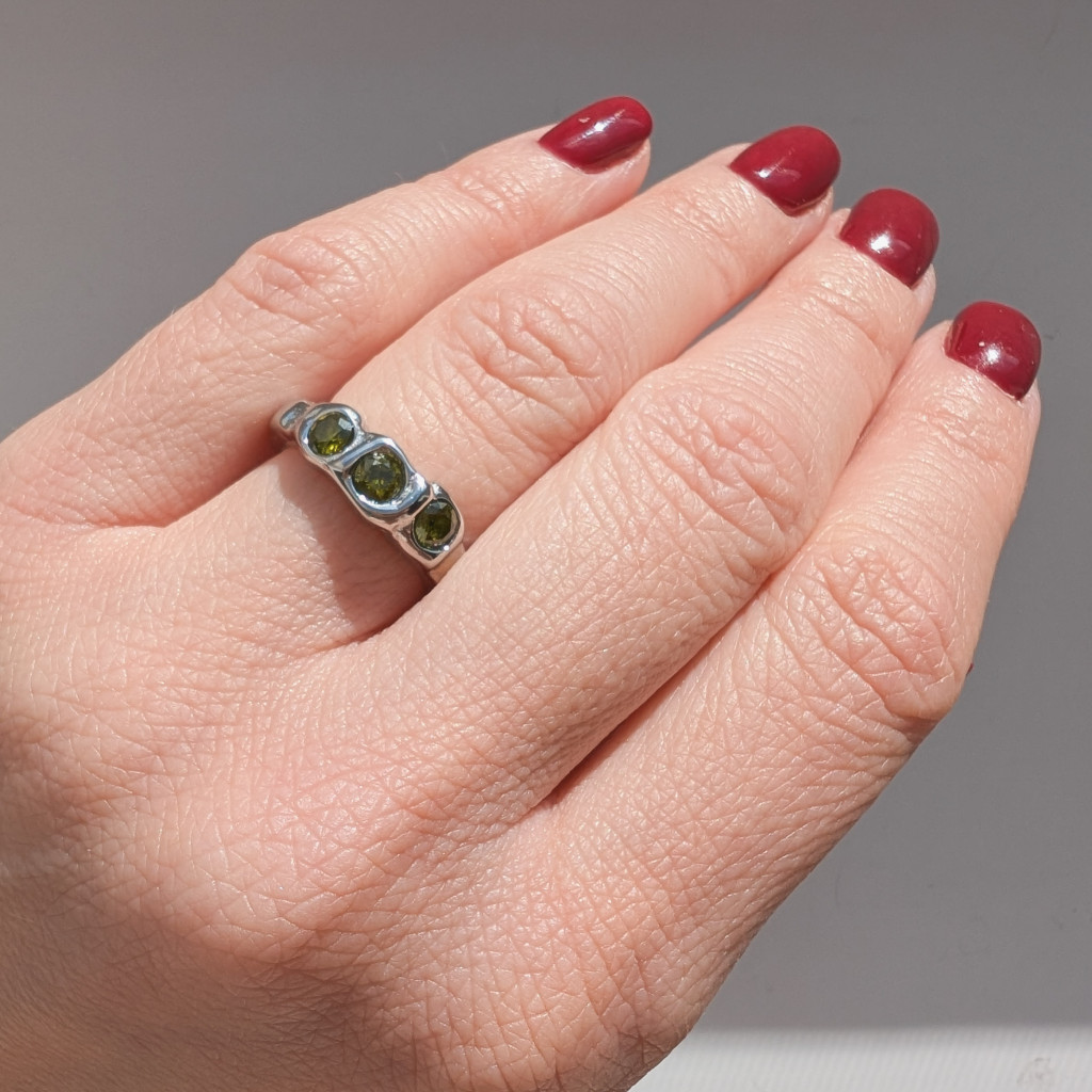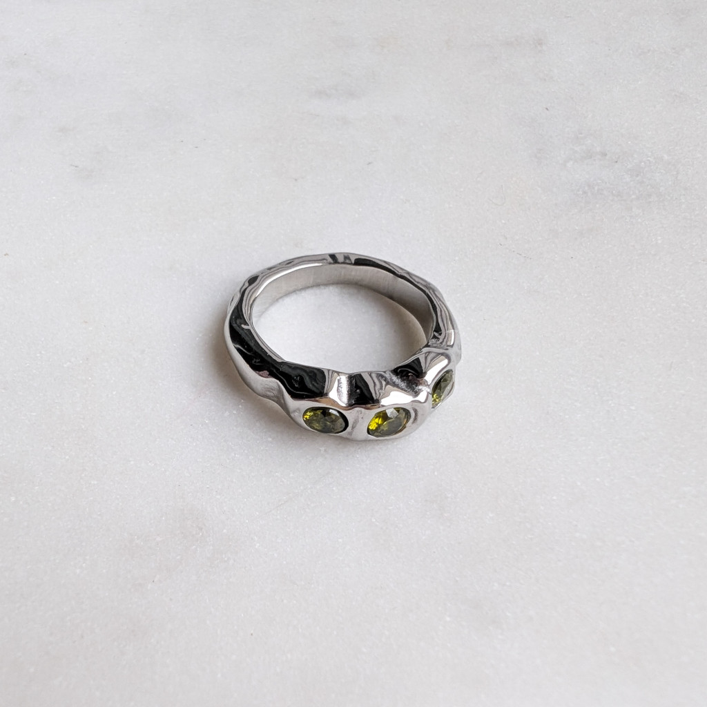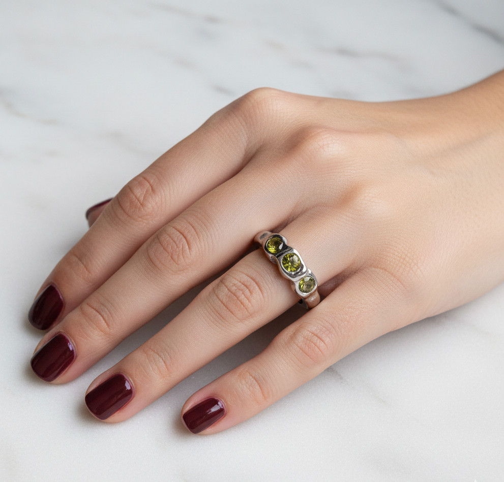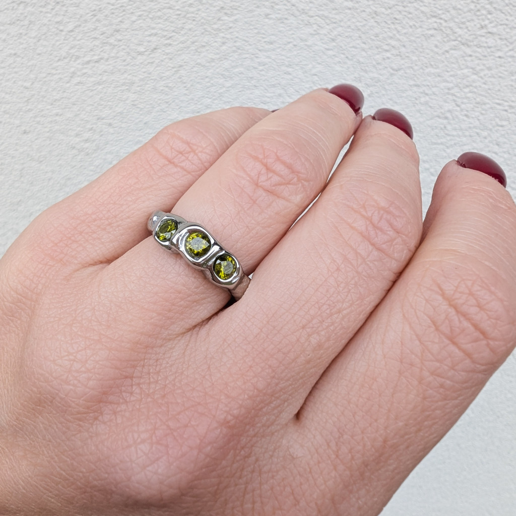 Kézzel készült hatást keltő, rusztikus felületű gyűrű, három kerek, zöld kővel díszítve.