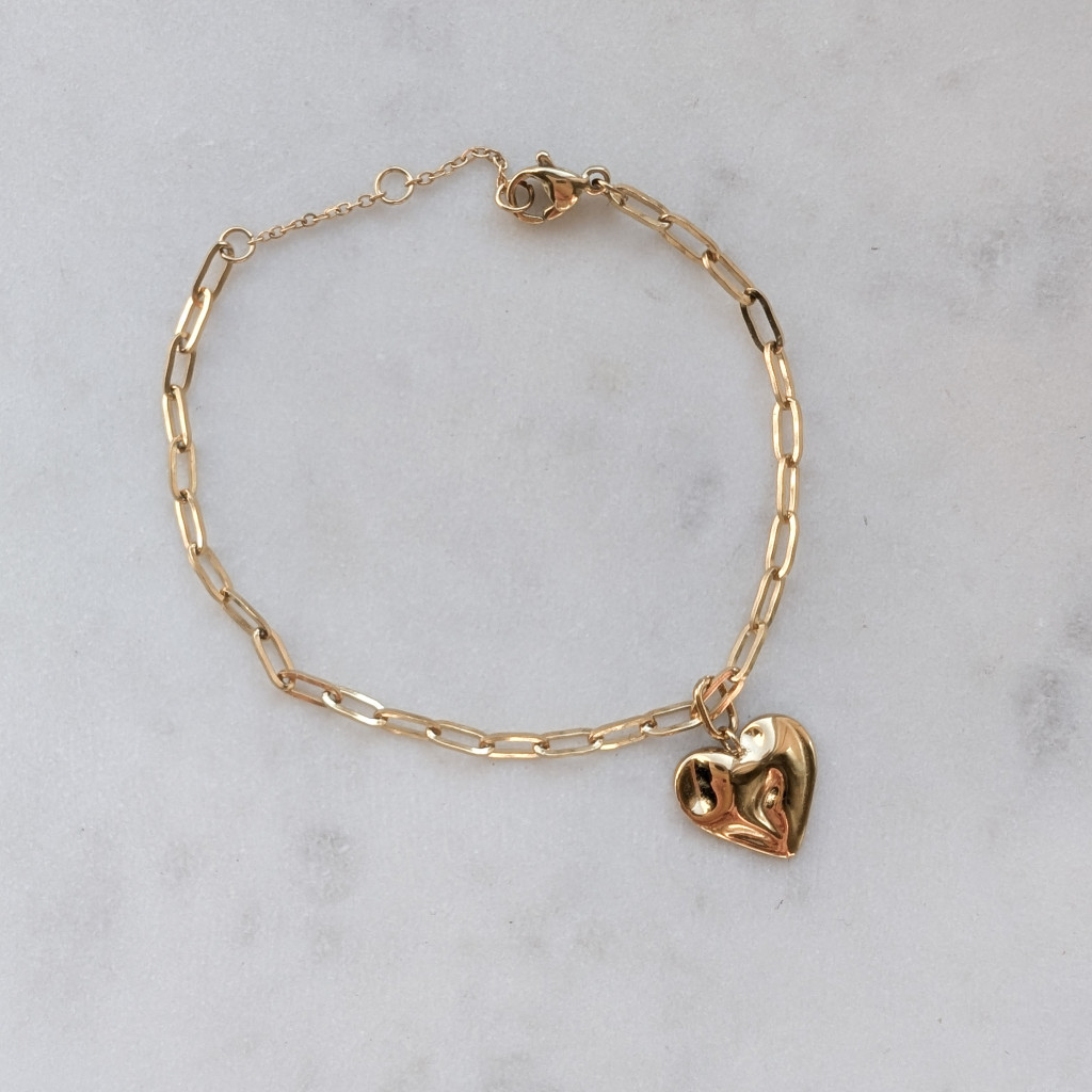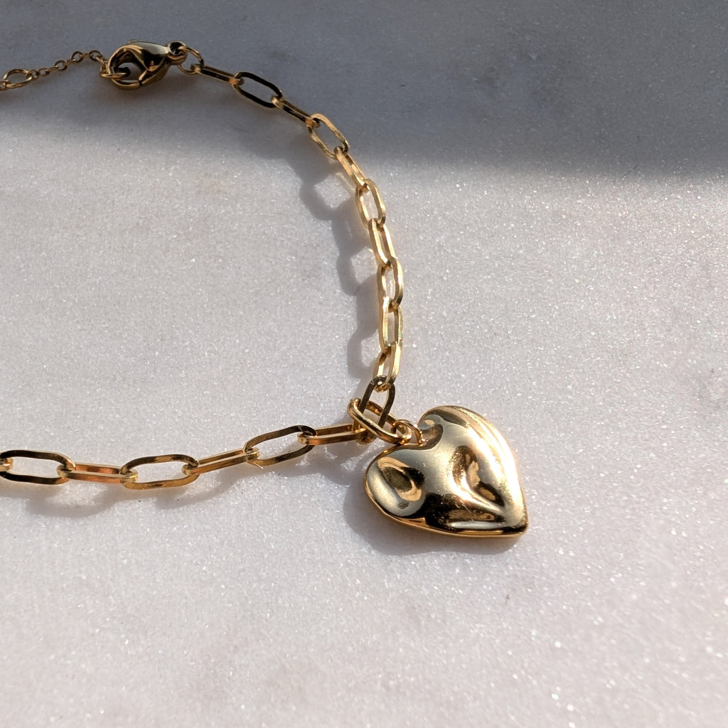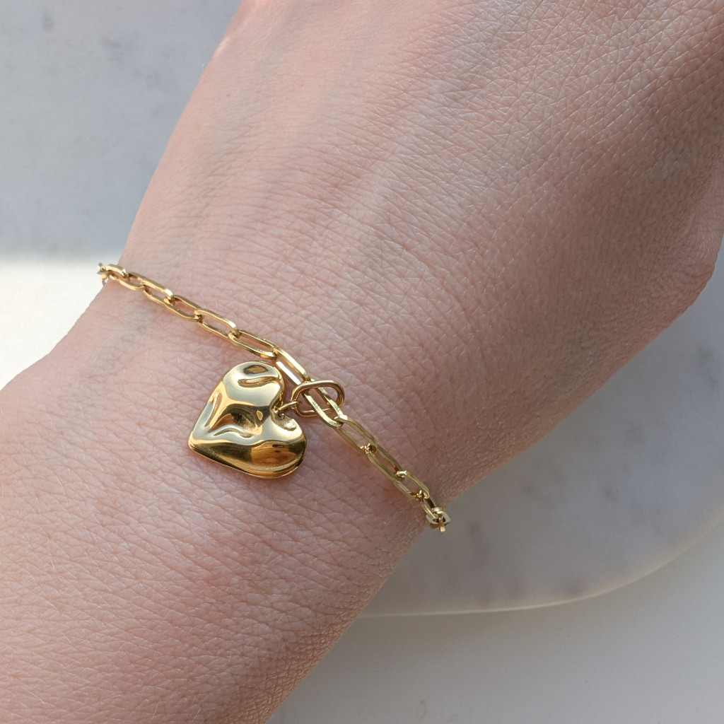 Vékony gemkapocs-láncos karkötő rusztikus szív függővel, vízálló nemesacélból.