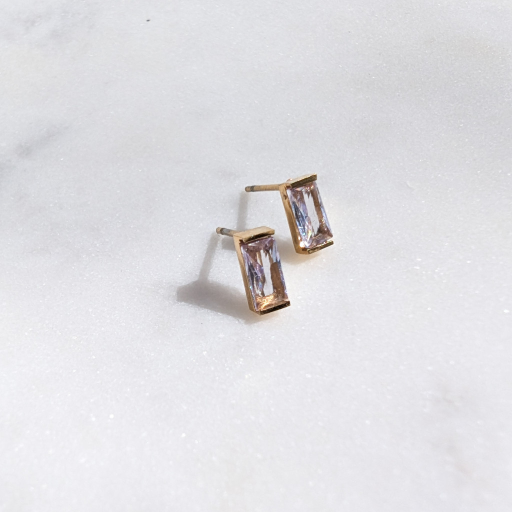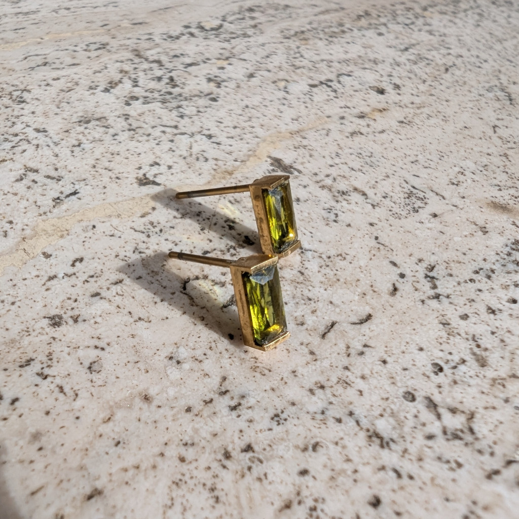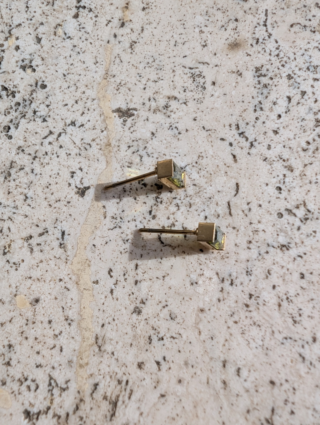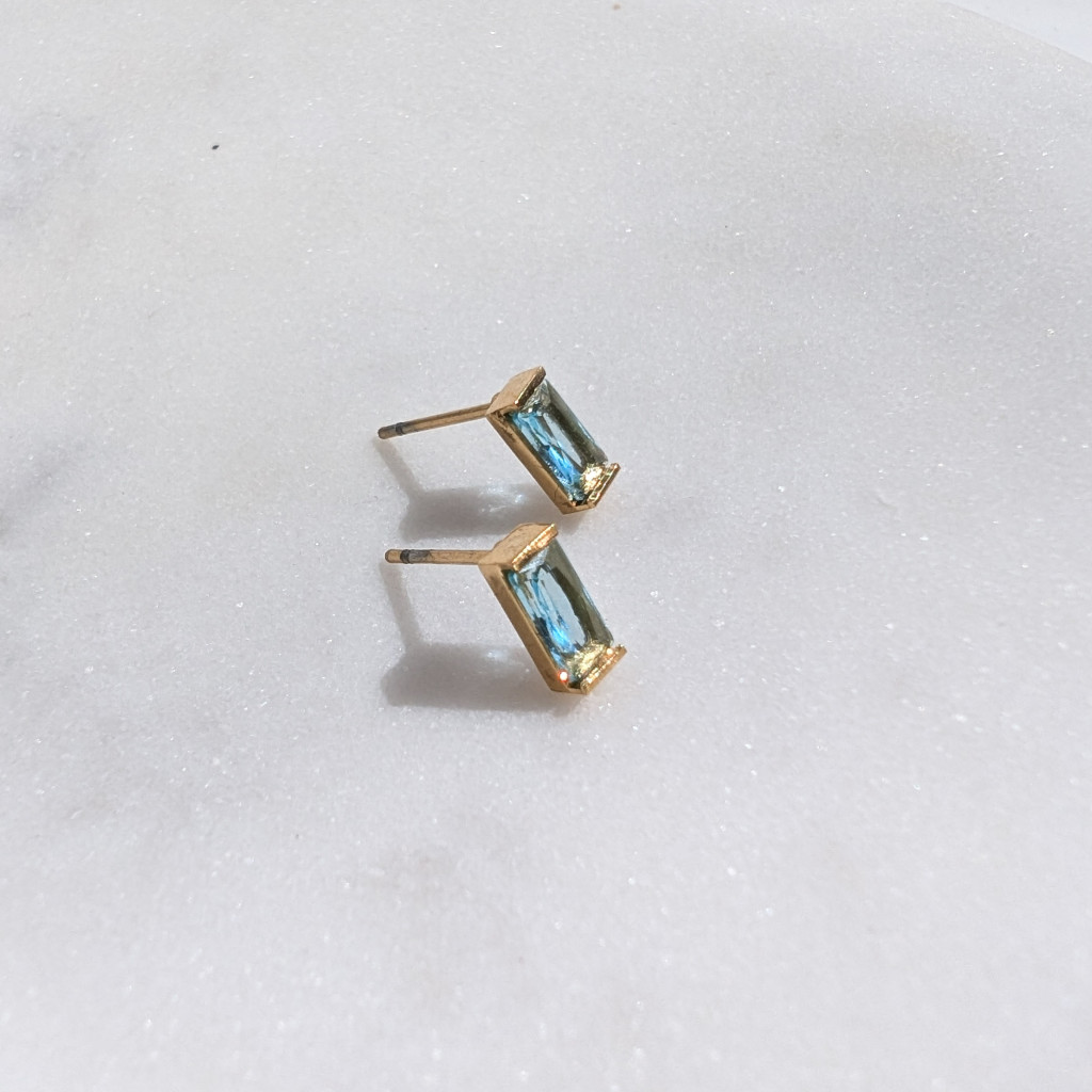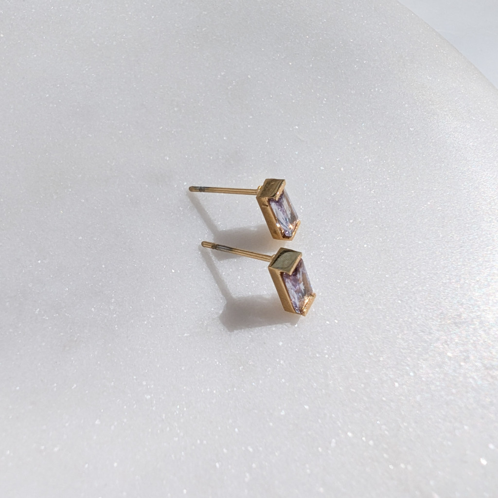 Téglalap alakú, minimalista fülbevaló, melyet csiszolt üveg díszít. Anyaga antiallergén nemesacél (orvosi fém), így nem irritálja a füled.