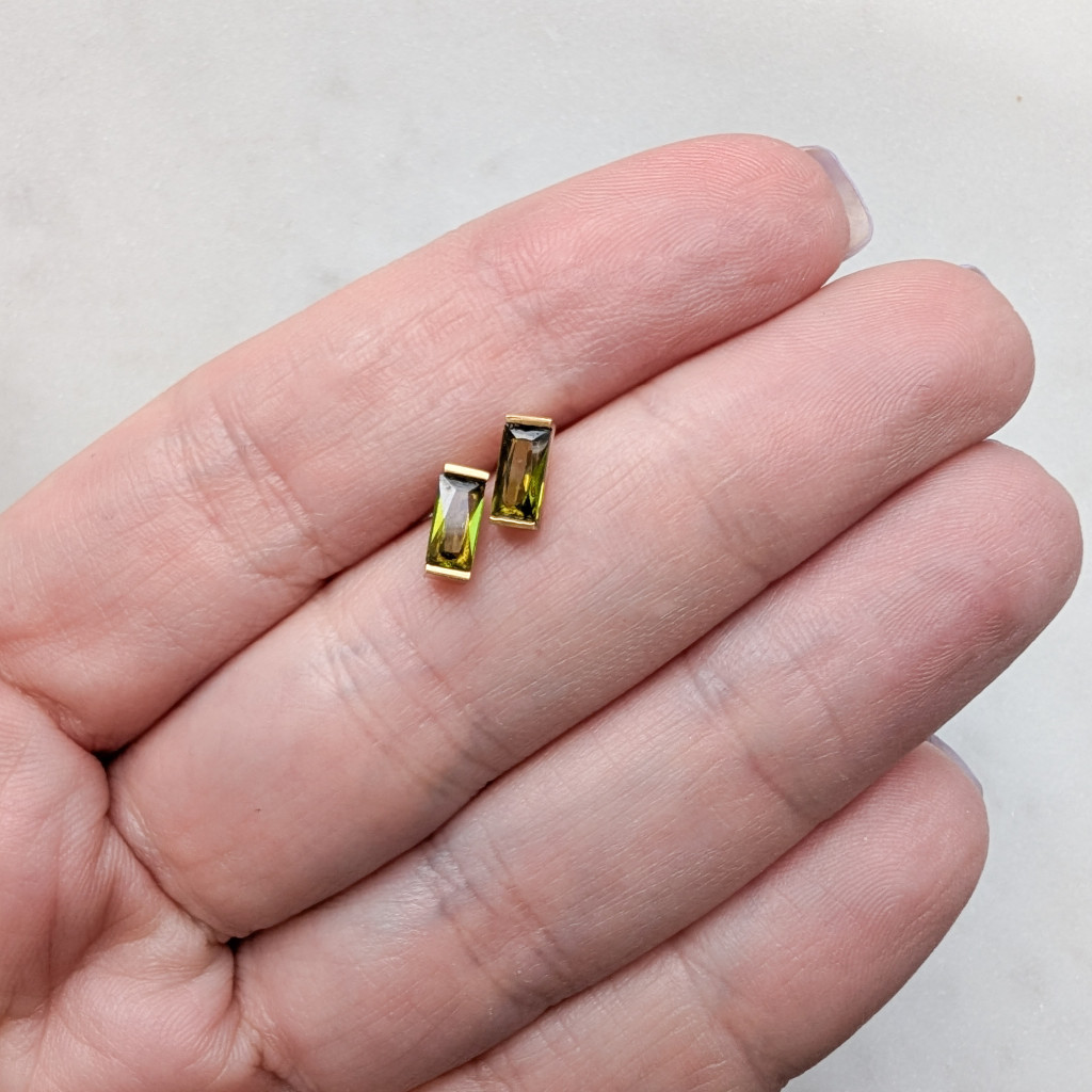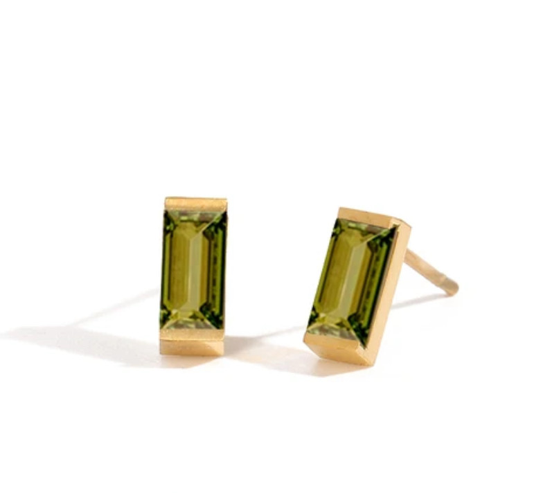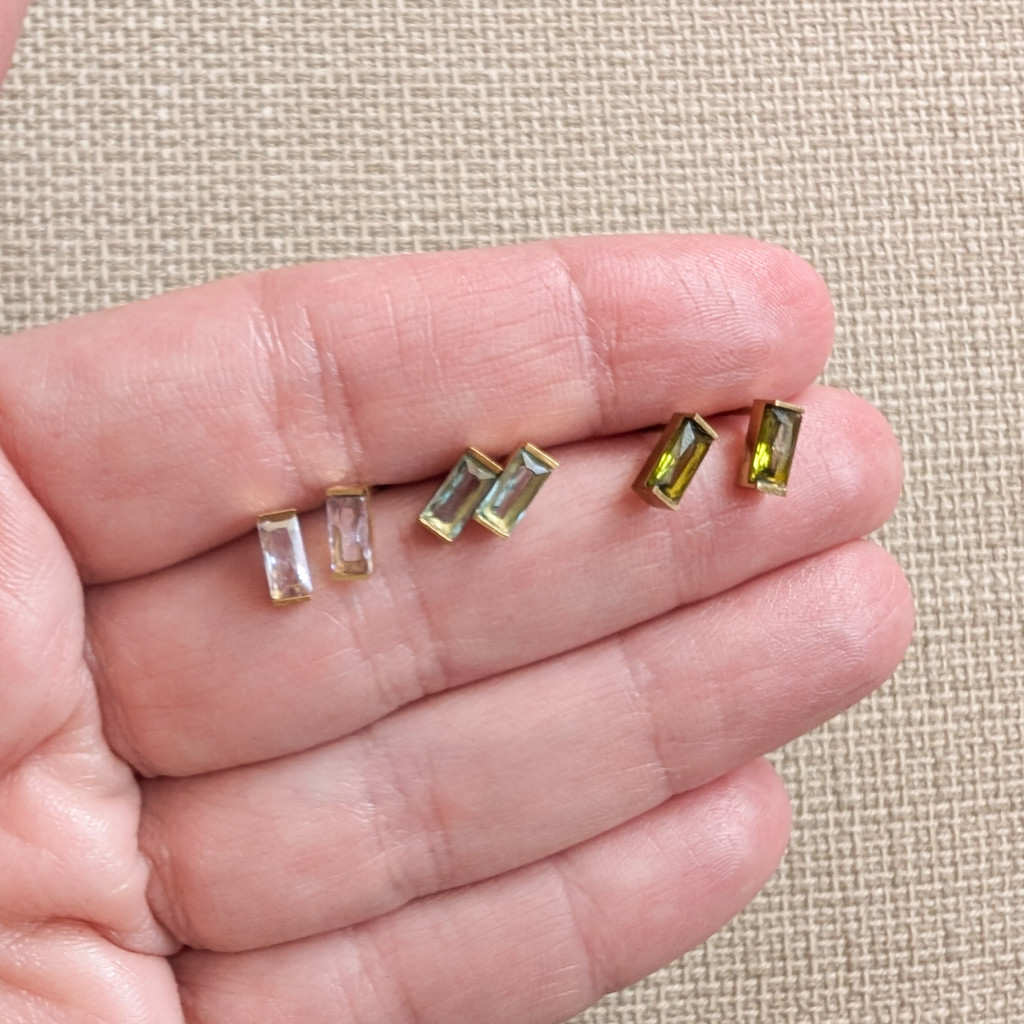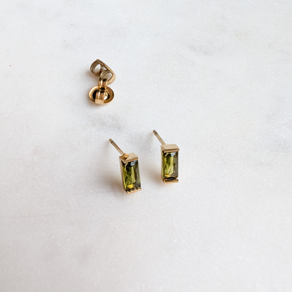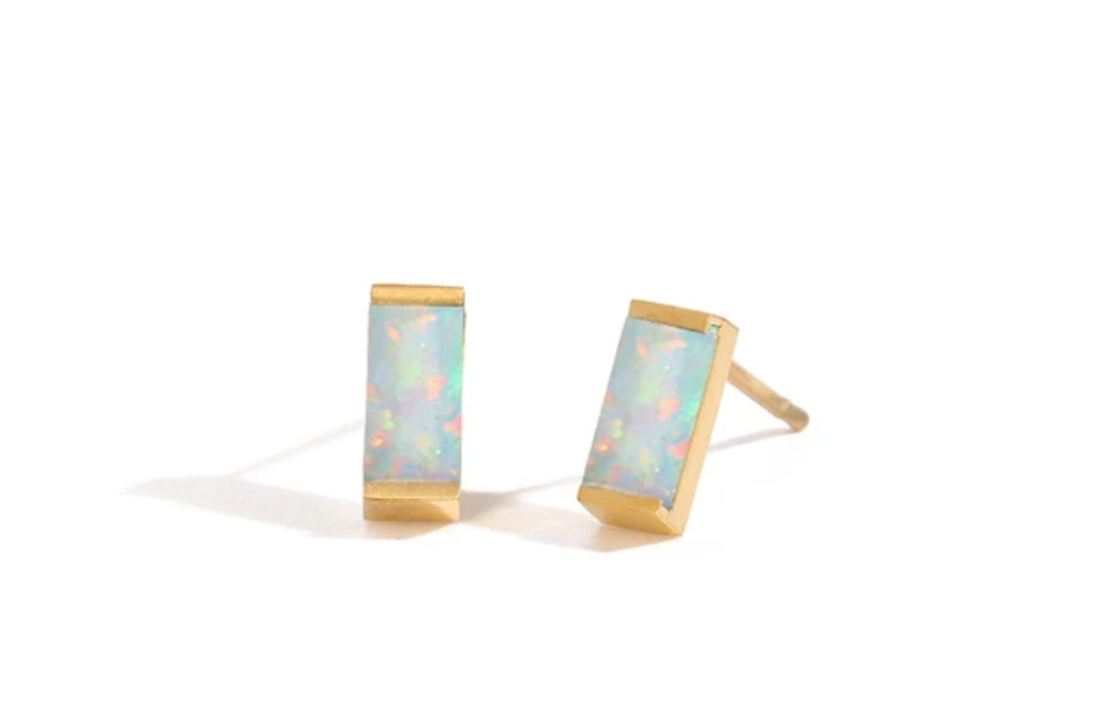 Téglalap alakú, minimalista fülbevaló, melyet csiszolt üveg díszít. Anyaga antiallergén nemesacél (orvosi fém), így nem irritálja a füled.