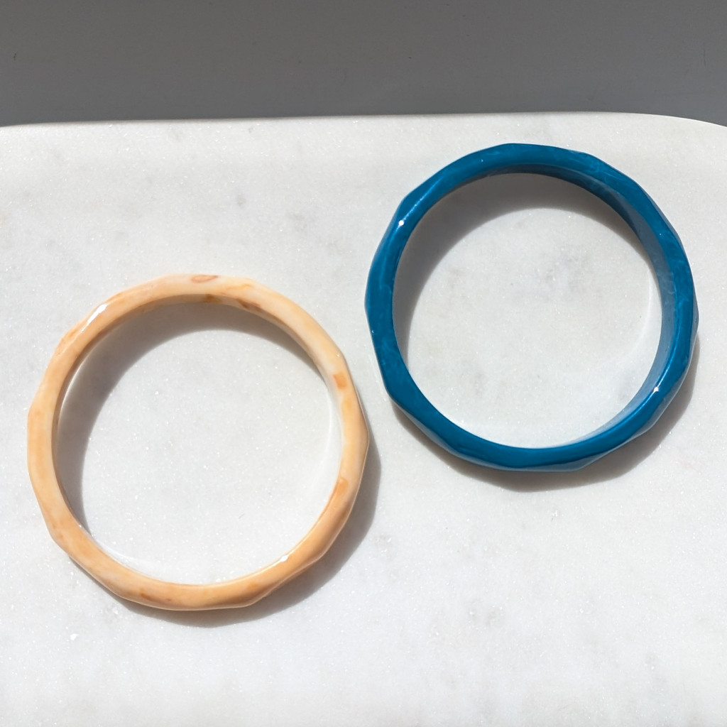 Vékony akril karperec, texturált, érdekes felülettel. Ideális nyári kiegészítő, vintage stílusával, vidám színeivel.
